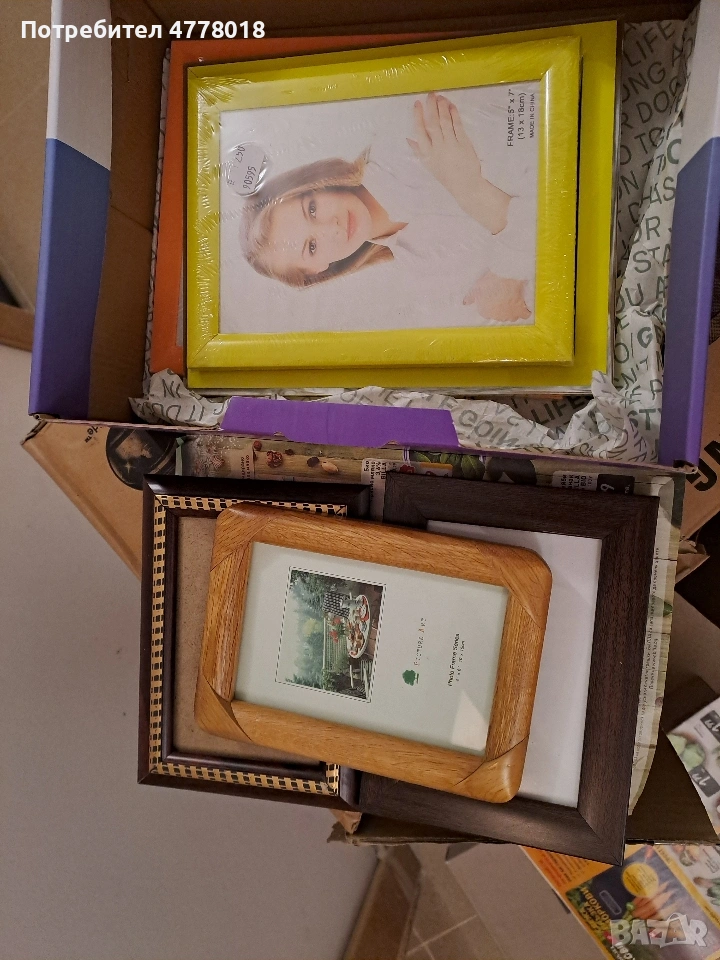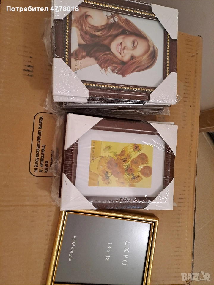 нови! Общо 186 броя Размери: 10х15 - 27 броя 13х18 - 67 броя 15х20 - 39 броя 20х25 - 31 броя А4 - 17 броя Дървени рамки със стъкло - 5 броя Картон - 280 броя Фотоалбуми - 3 броя: 2 броя 9х13 за 100 по снимки 1 брой 9х13 за 60 снимки В малко количество от тях има сложени рисувани картини с дантела, защото са били мостра. За София може лично предаване!