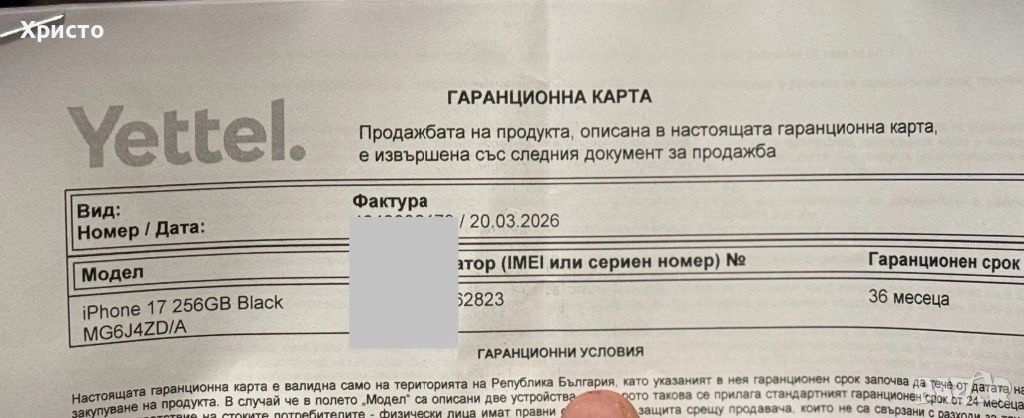 Закупен е на 20.03.2026 г. и има валидна гаранция от 36 месеца.