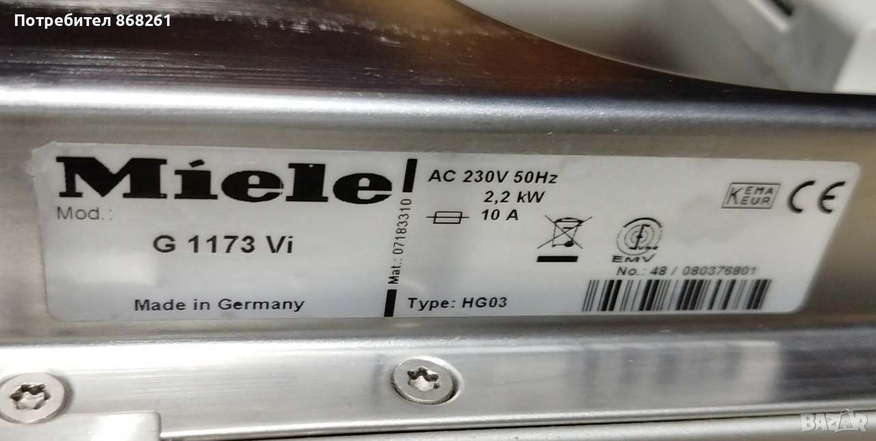 Това е класическа немска машина от „старата школа“ на Miele. Моделът G 1173 Vi е напълно интегрирана съдомиялна машина (Vi означава Vollintegriert – контролният панел е скрит в горния ръб на вратата). Ето най-важната информация, разчетена от табелката и техническите спецификации на модела: 1. Основни технически параметри Производство: Произведена в Германия (Made in Germany). Този период на производство се слави с изключително високо качество на компонентите. Захранване: Работи на стандартни 230V, честота 50Hz. Мощност: Максимална мощност 2,2 kW. Това е важно при избора на предпазител (изисква минимум 10А, както е посочено на стикера). Тип/Шаси: HG03. 2. Ключови характеристики на серията