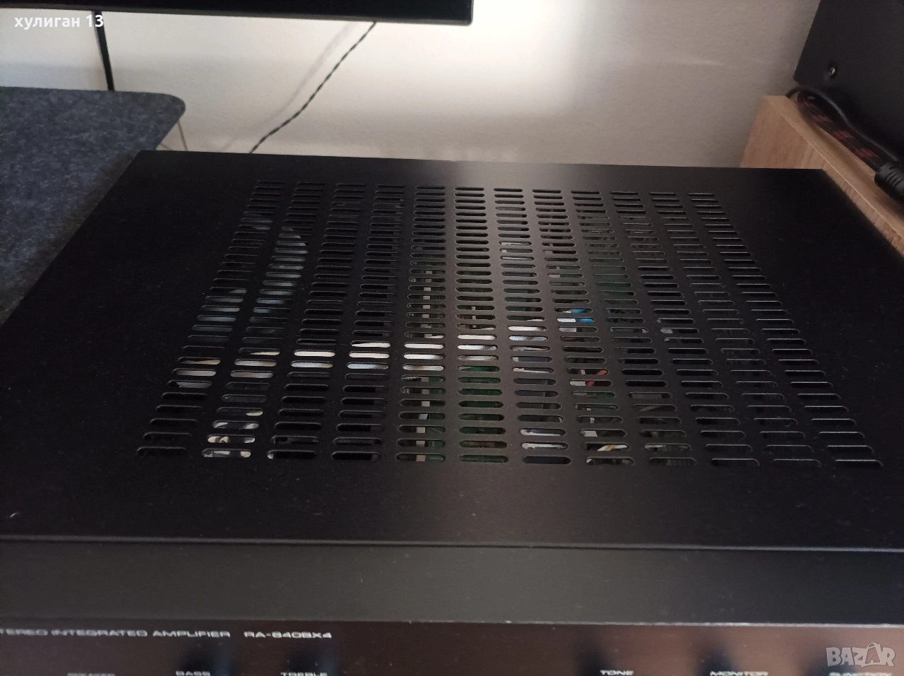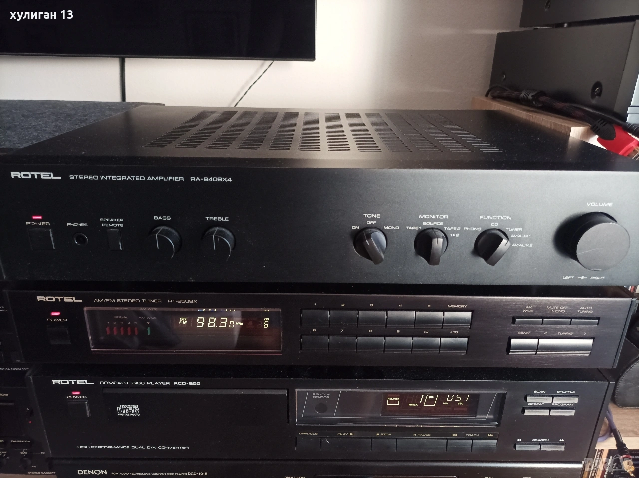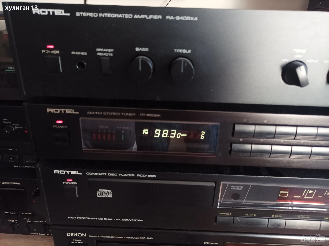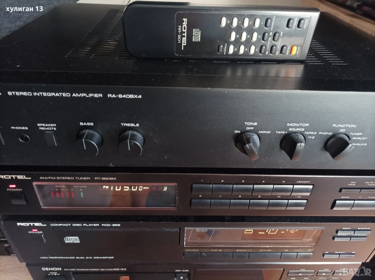 2. Усилвателят Rotel RA-840BX4 също е легендарна английска транзисторна машина, получила няколко награди през 90-те години. С масивен тороидален траф, осигуряващ мощно и постоянно захранване към крайното стъпало за постигане на 50 чисти вата на 8 ома. Може да работи с два чифта тонколони от 4 до 16 ома. Фабрично не поддържа дистанционно управление. Изцяло изграден с идеята за постигане и възпроизвеждане на максимално точен и чист hi-fi звук. В отлично състояние. Характеристики в hifi wiki.de