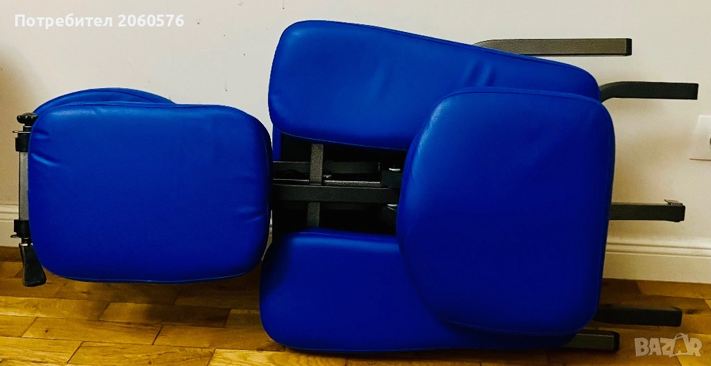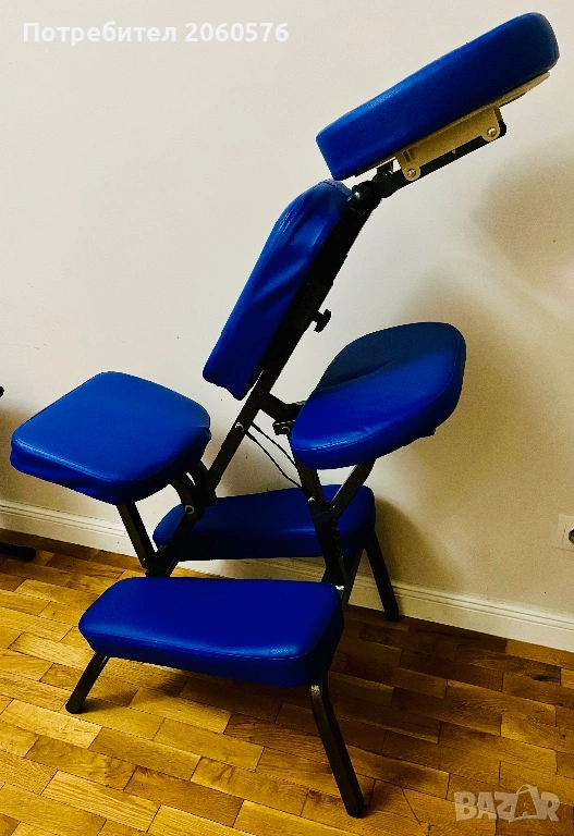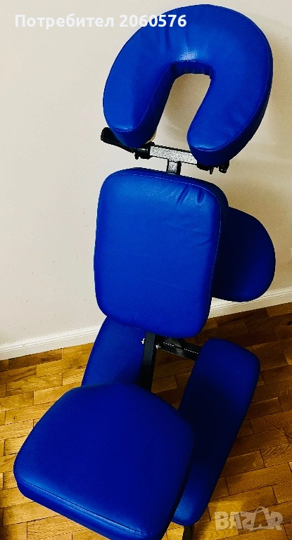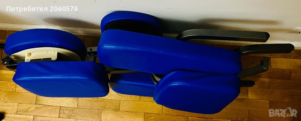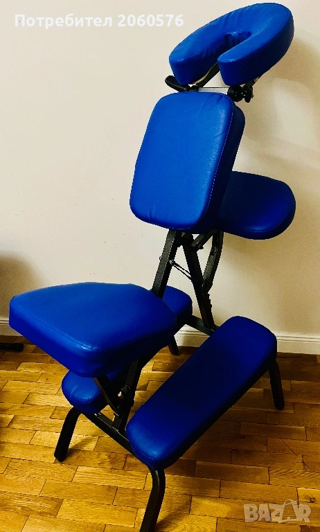 Столът за масажисти разполага с мека подложка за лице, подложка за гърдите, подлакътник и две подложки за крака.