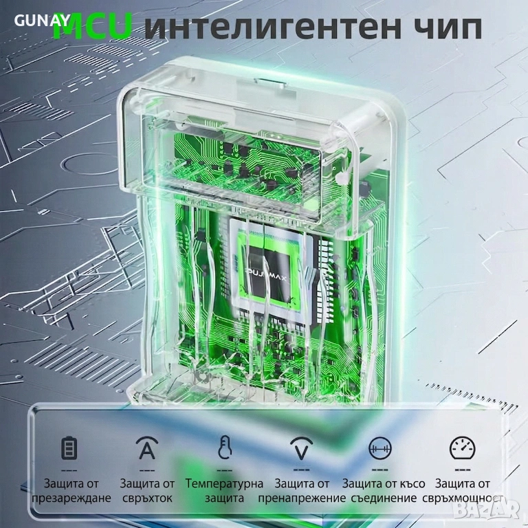 - Интелигентен чип за предотвратяване на грешки: осигурява защита от презареждане, късо съединение и обръщане на поляритета.