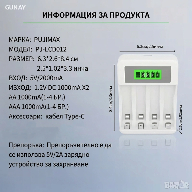 - Съвместимост: AA и AAA (NiMH и NiCd акумулаторни батерии)