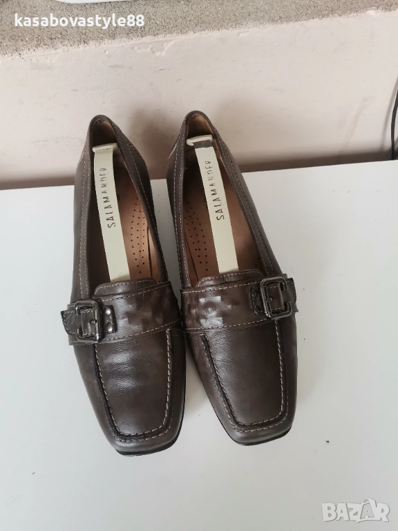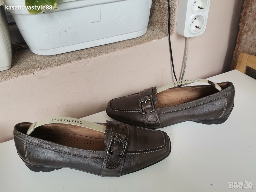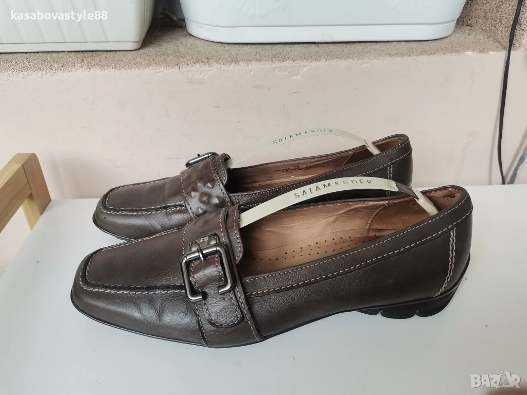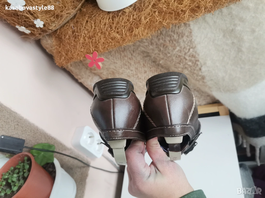 Дамски ежедневни обувки, тип мокасини в класически стил, направени от естествена кожа в кафяв цвят с регулираща катарама. Ходилото при тях е олекотено и ултра еластично, а вътрешността е с кожена комфортна и много мека стелка за максимално удобство при носене. Дължина на стелка 25.6см.Ходило 2см.Цялостна височина отзад 8.5см.