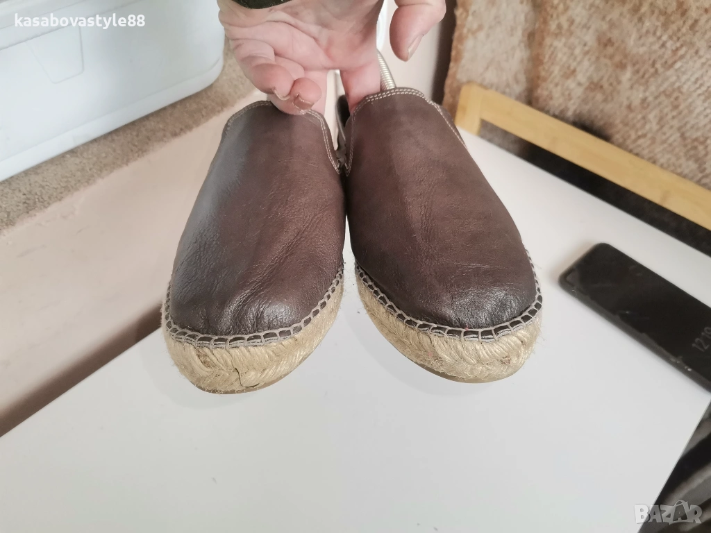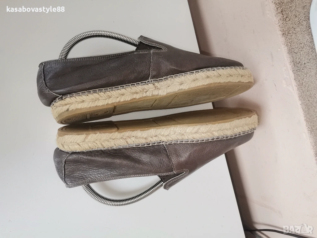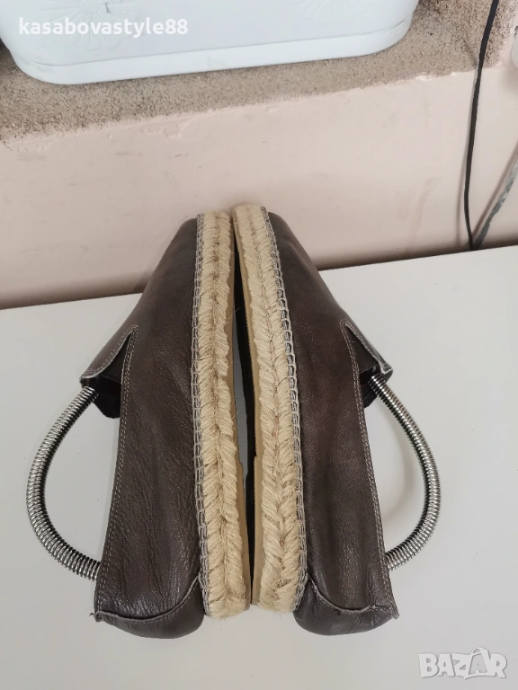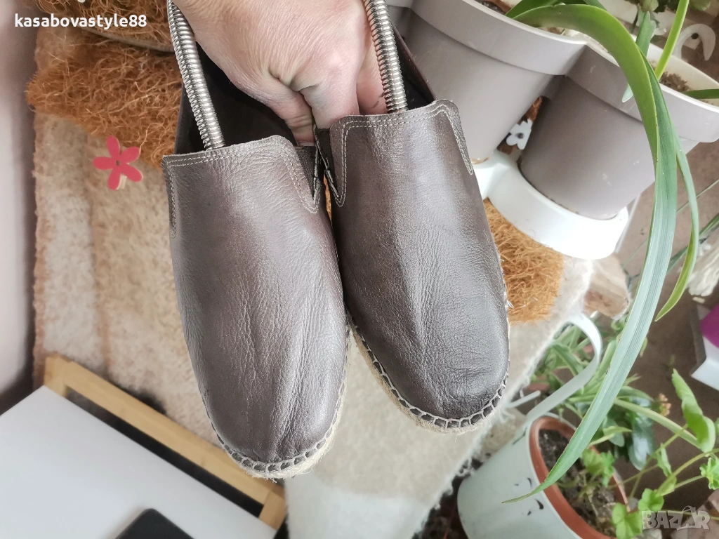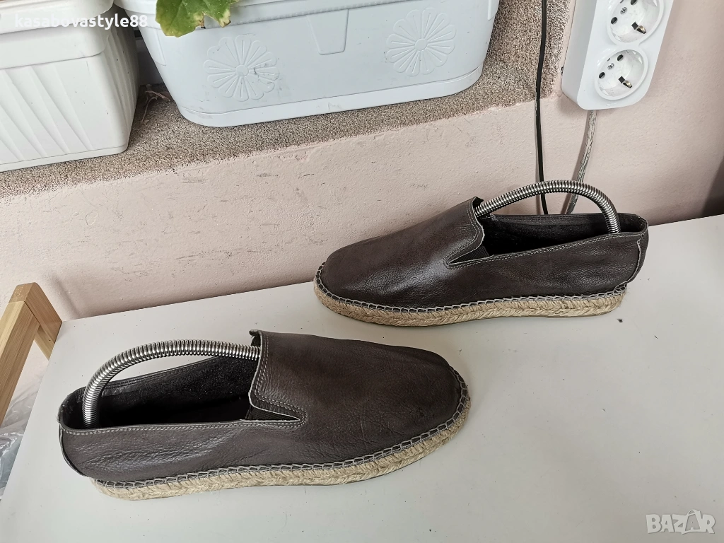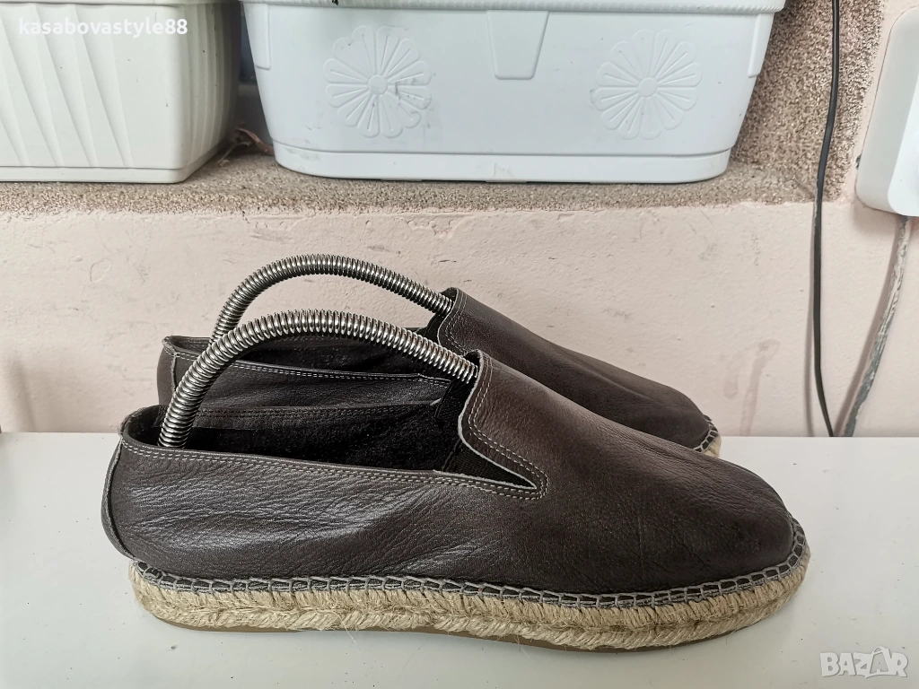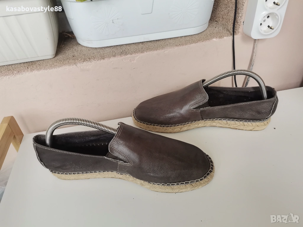 Дамски висококачествени еспадрили, тип мокасини от направени от естествена кожа в тъмно-кафяв цвят и ластички от 2 те страни. Те се отличават с плетена конопена подметка и еластича кожа.Вътрешността е с много мека кожена стелка и комфортно ходило. По етикет се водят 41 н.но по-скоро отговарят на 40.5н.Дължина на стелка 26.6см.Ходило 2см.Цялостна височина отзад 8см.