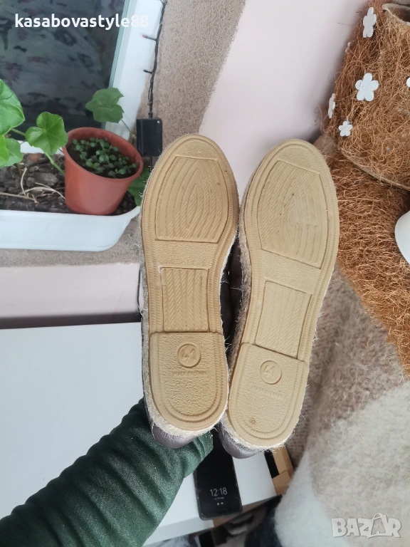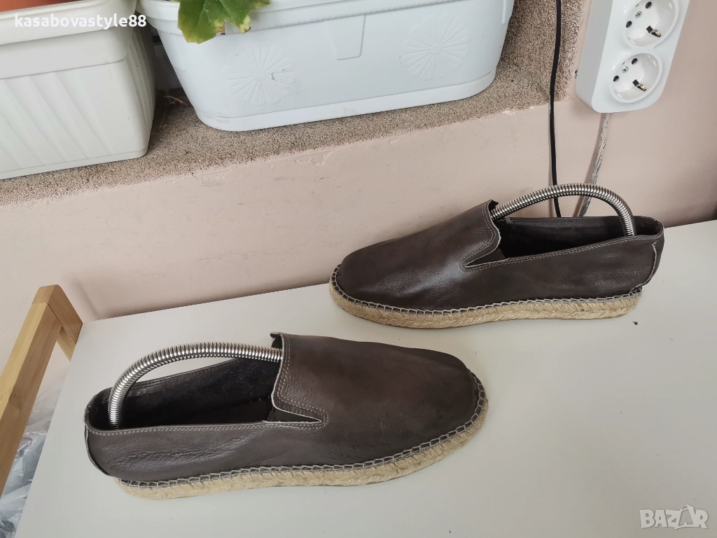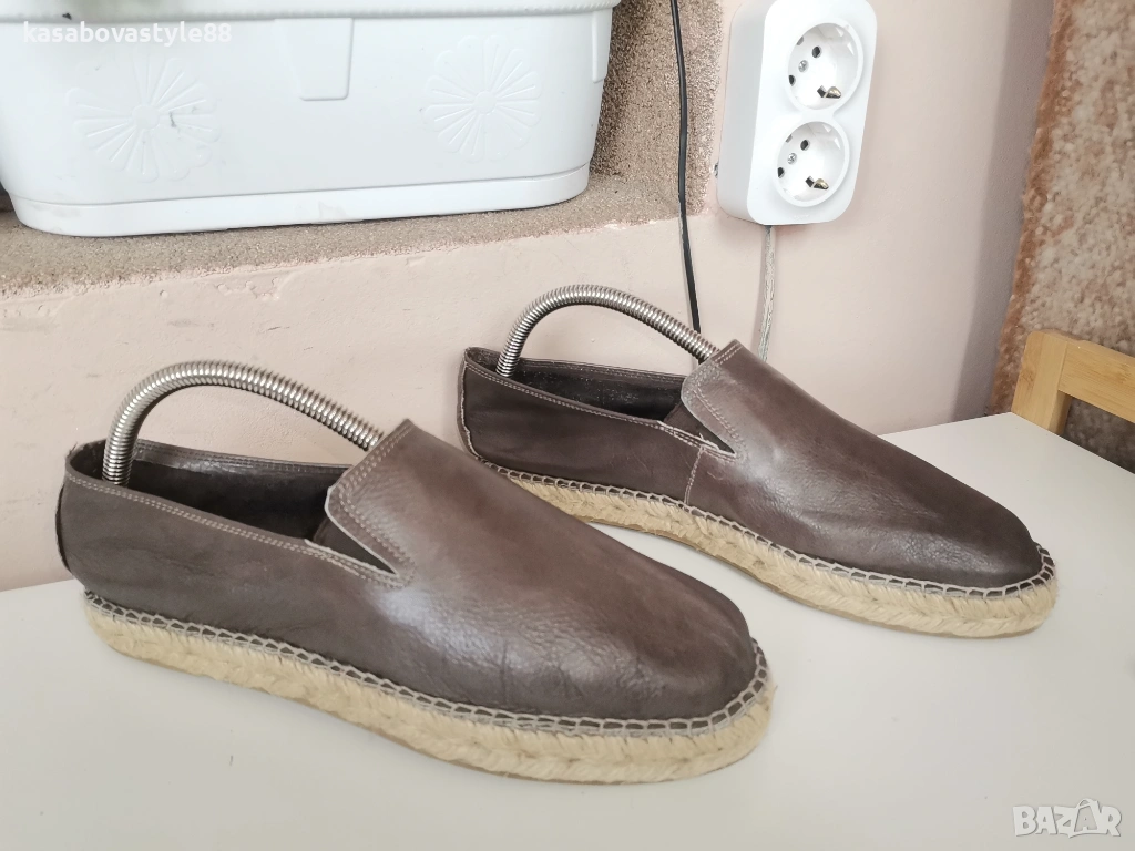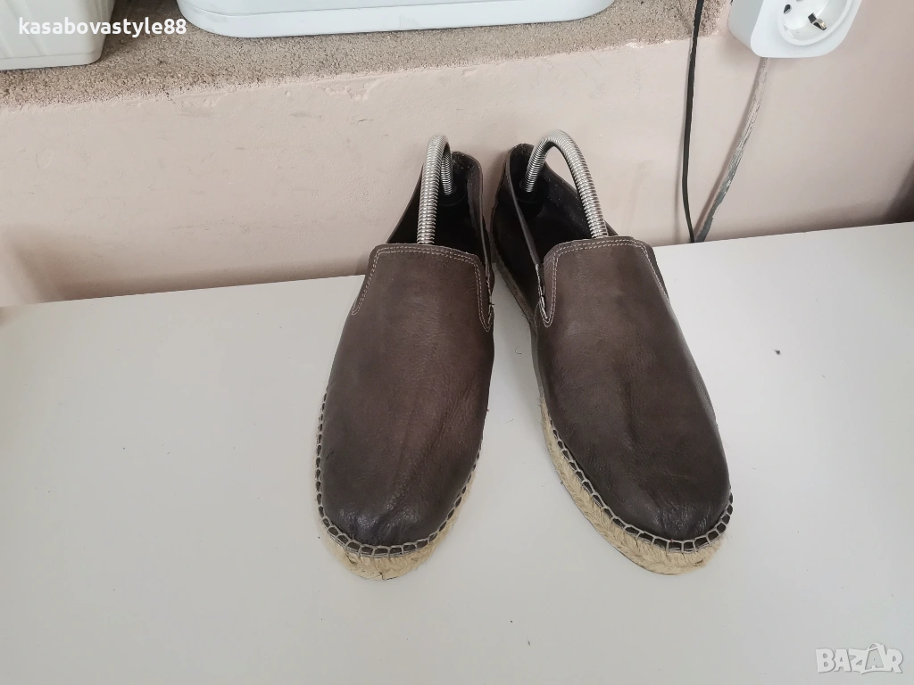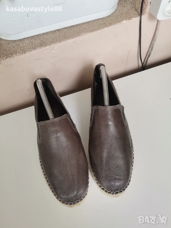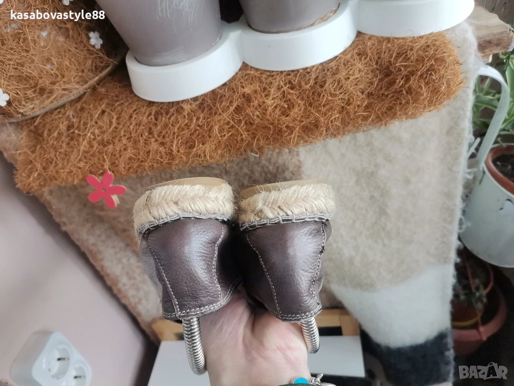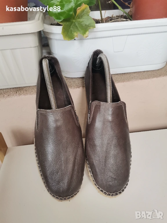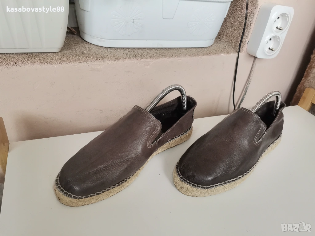 Дамски висококачествени еспадрили, тип мокасини от направени от естествена кожа в тъмно-кафяв цвят и ластички от 2 те страни. Те се отличават с плетена конопена подметка и еластича кожа.Вътрешността е с много мека кожена стелка и комфортно ходило. По етикет се водят 41 н.но по-скоро отговарят на 40.5н.Дължина на стелка 26.6см.Ходило 2см.Цялостна височина отзад 8см.