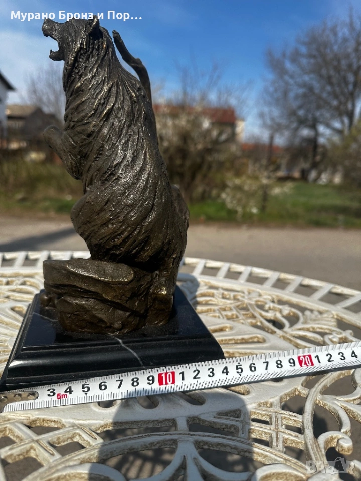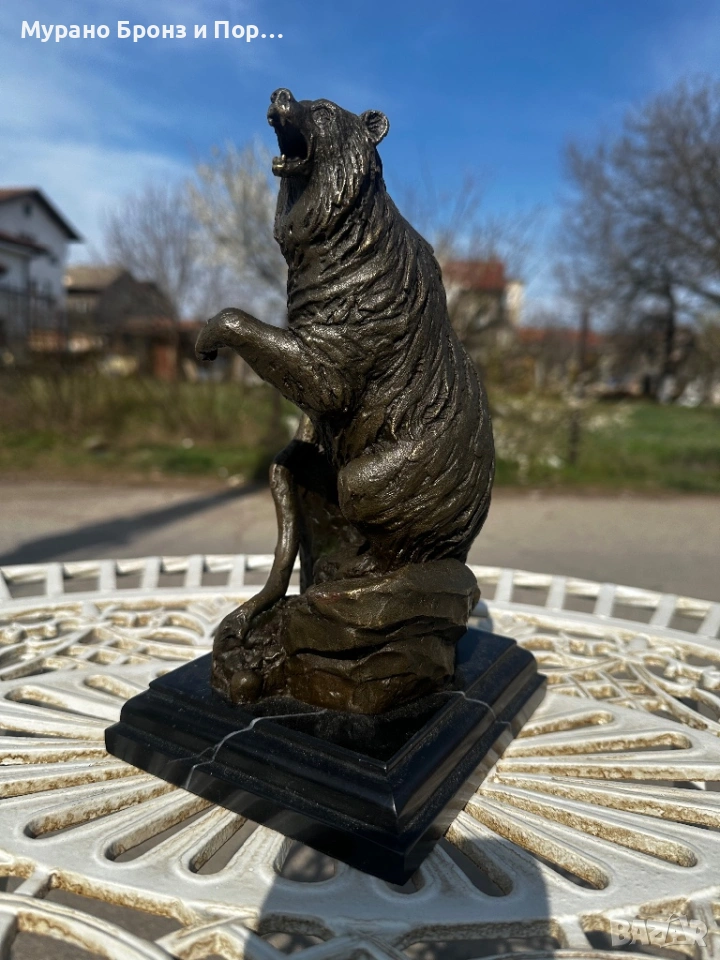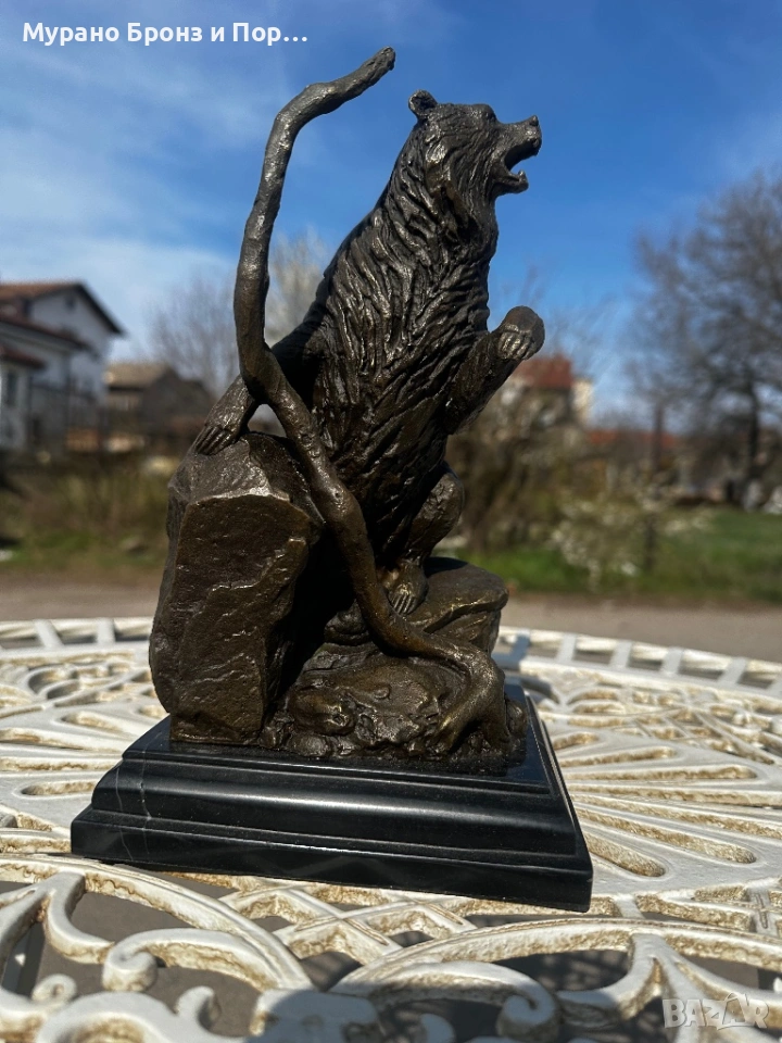 Продавам внушителна и висококачествена статуетка от истински бронз върху стабилна основа от черен мрамор. Фигурата изобразява мощна сцена на ревяща мечка, изправена на задните си крака върху скала.