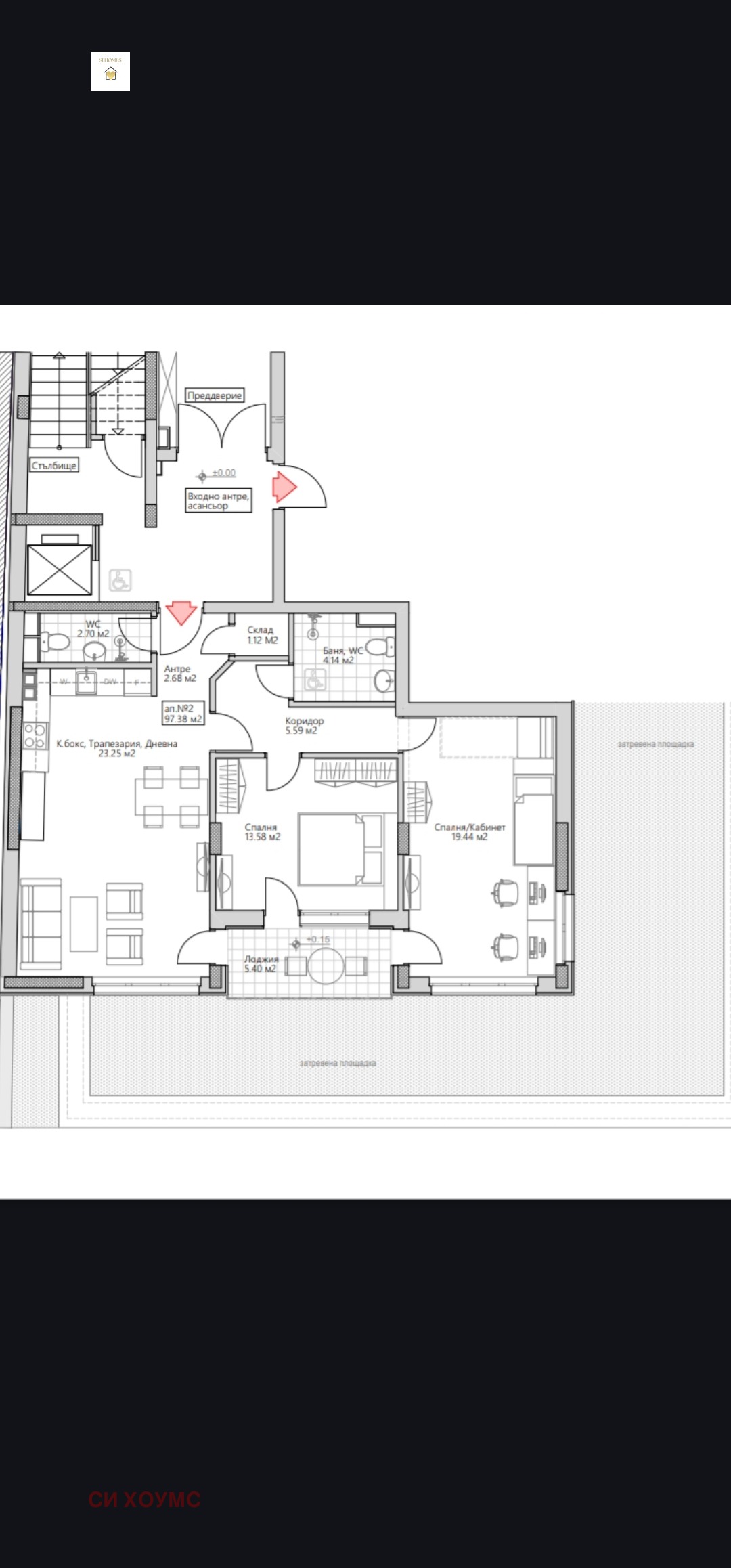 Площ: 112 кв.м. (с общи части) / 98 кв.м. (чиста застроена площ).