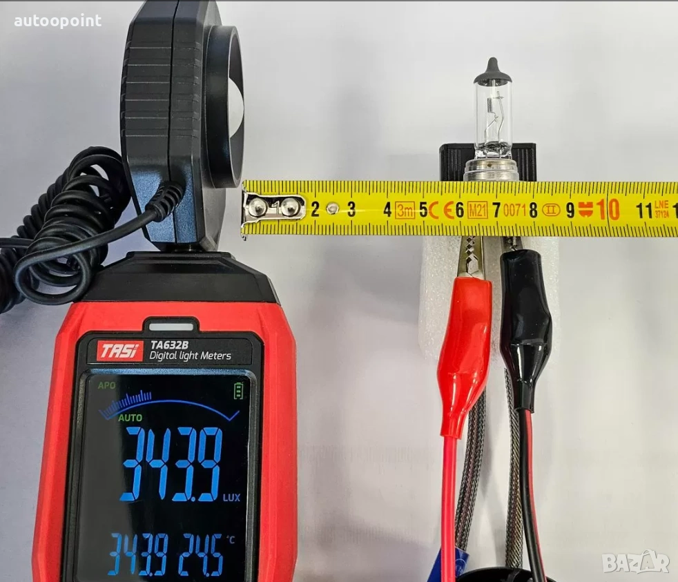 - Сила на светене: 170 000 лукса измерени на 7см. от източника на крушката (за сравнение на халогенна крушка, измерената сила на 7см. от източника е 10700 лукса, което е близо 17 пъти повече. В снимките може да се видят реалните стойности, на двата вида крушки измерени с луксомер модел TA632B, измерващ максимум до 200 000 лукса, като при всички стойности измерени над 99 999 лукса на дисплеят се появява индикатор "х10", което означава че ако имаме измерени 155 000 лукса, на диспеят ще се покаже 15 500 и ще светне индикатора "х10".)