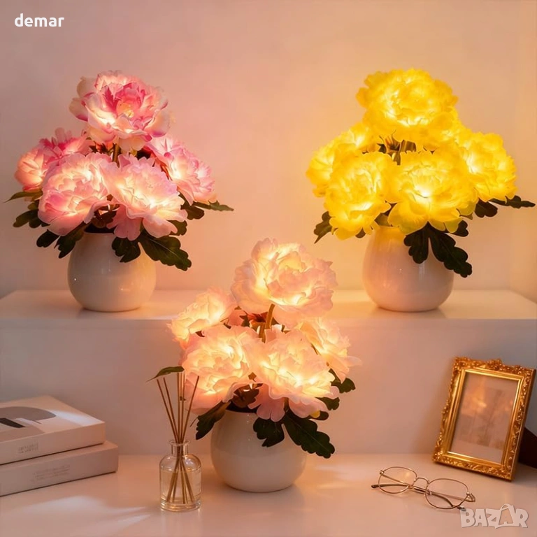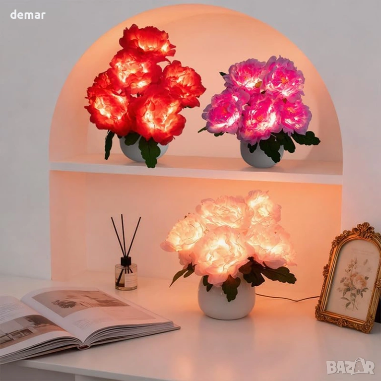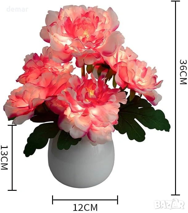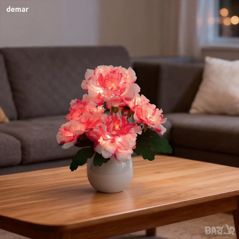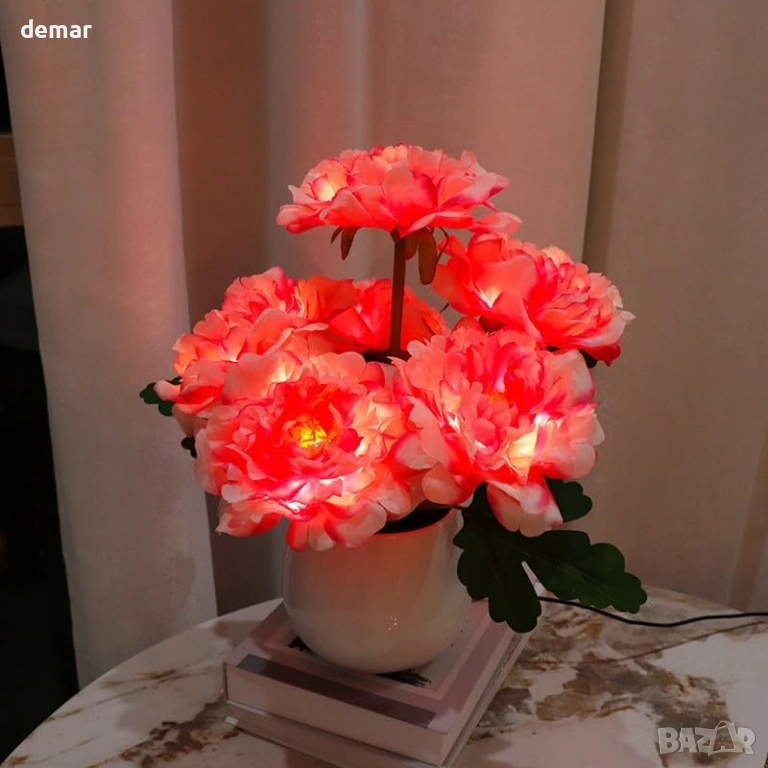 Елегантна лампа с изкуствени цветя във формата на божур, съчетаваща декоративна привлекателност с меко амбиентно осветление, с безстепенно димиране за регулируема яркост чрез USB кабел. Захранва се от всеки USB източник, като например power bank или компютър, което позволява гъвкаво поставяне без нужда от контакти. Проектирана с реалистични копринени цветя, огъващи се клони за персонализирано оформяне и издръжлива керамична саксия, която запазва външния си вид с течение на времето. Функционира както като нощна лампа, така и като декоративен елемент, подходящ за различни вътрешни пространства, включително спални, дневни и търговски помещения, като същевременно служи и като внимателен, визуално привлекателен подарък за множество поводи.