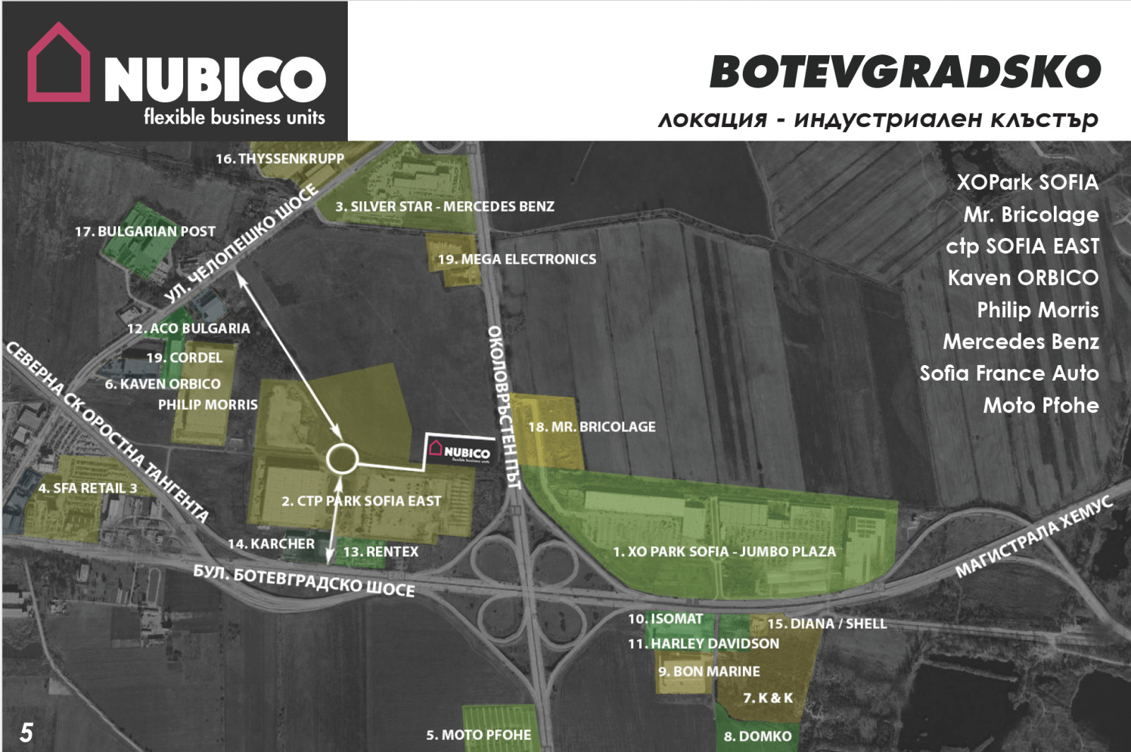 След успеха на NUBICO - Герман, се радваме да ви предложим нов, строящ се търгоско-складов комплекс, NUBICO - Ботевградско, състоящ се от офиси, магазини и складове, намиращ се на детелината на Ботевградско шосе и Околовръстен път. В съседство на базите на cTP, ORBICO, Philip Morris, Mercedes-Benz, Cordeel, новите Мосю Бриколаж и XO Парк, Jumbo и много други. Отлично развита локация. Бърз достъп от/към всички направления на движение. NUBICO - Ботевградско се състои от 40 склада (1690 евро на кв.м. без ДДС) и 20 магазина за промишлени стоки с офиси (1375 евро на кв.м. без ДДС). Складовете са с площи от 100, 120, 190, 217 и 260 кв. м., с работна височина 7,5 м., с възможност за обединяване на съседни. Магазините и офисите са с площ от по 40 кв.м, с възможност за обединяване на съседни. Магазините и офисите се продават само с прилежащите зад тях складове. Очакваният пусков срок е четвърто тримесечие на 2026г. Последни налични бройки.