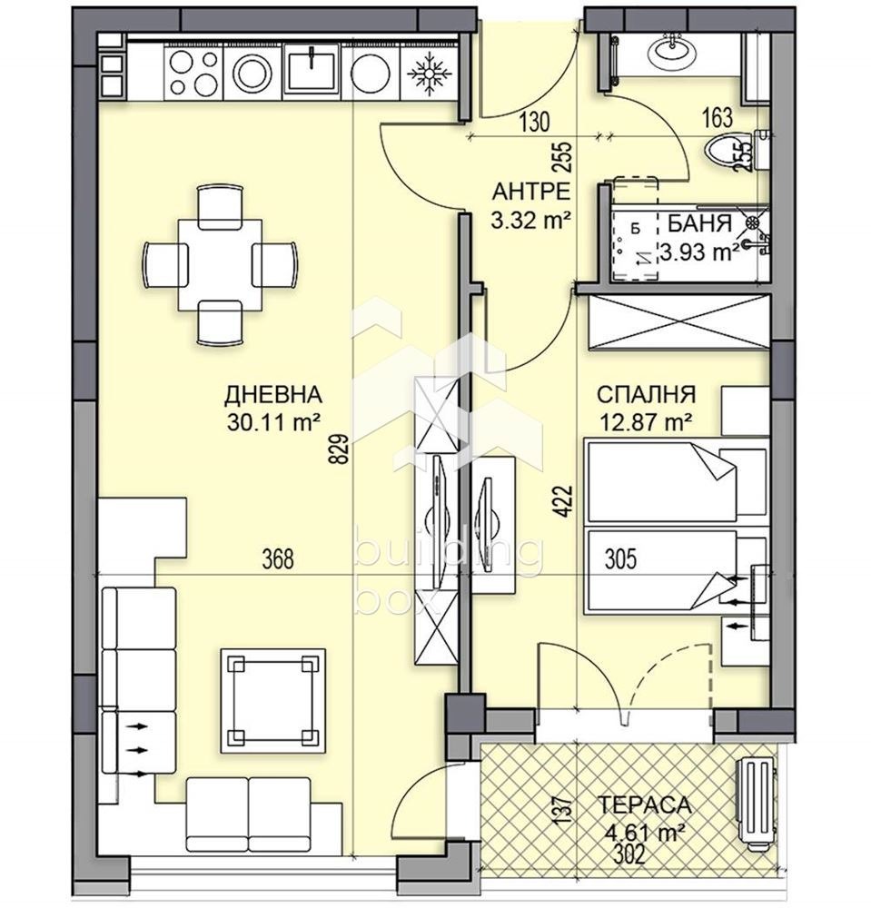 - РАЗПРЕДЕЛЕНИЕ: Просторна всекидневна с кухненски бокс, с площ от 30 кв.м, спалня, антре, баня с тоалетна и тераса.