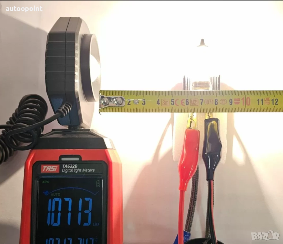 - Сила на светене: 170 000 лукса измерени на 7см. от източника на крушката (за сравнение на халогенна крушка, измерената сила на 7см. от източника е 10700 лукса, което е близо 17 пъти повече. В снимките може да се видят реалните стойности, на двата вида крушки измерени с луксомер модел TA632B, измерващ максимум до 200 000 лукса, като при всички стойности измерени над 99 999 лукса на дисплеят се появява индикатор "х10", което означава че ако имаме измерени 155 000 лукса, на диспеят ще се покаже 15 500 и ще светне индикатора "х10".)