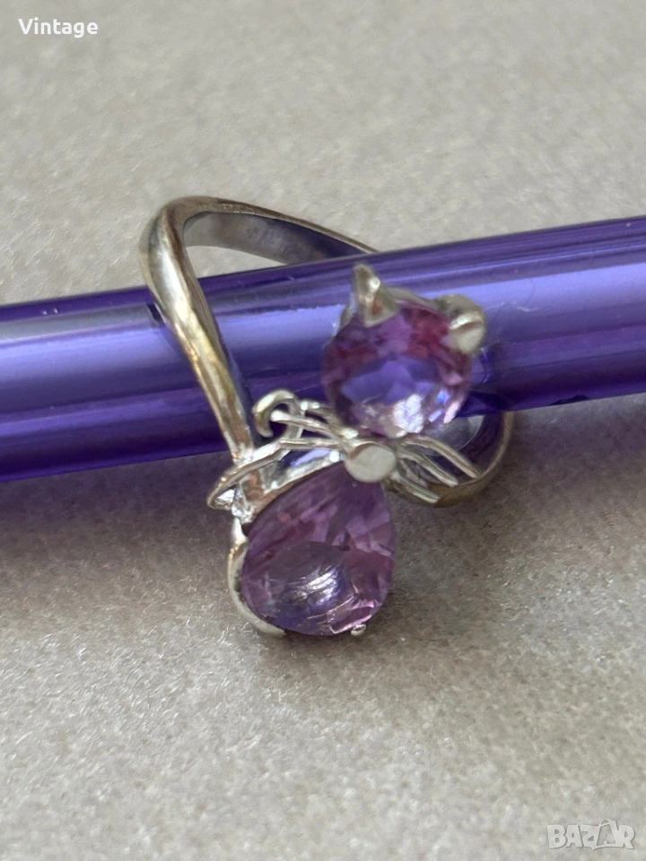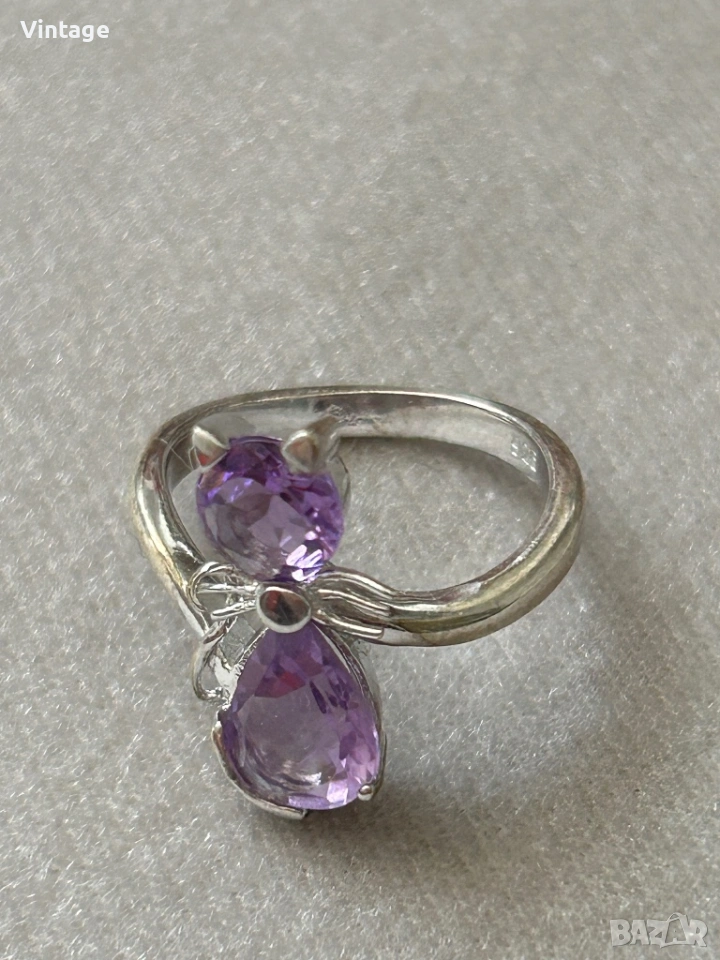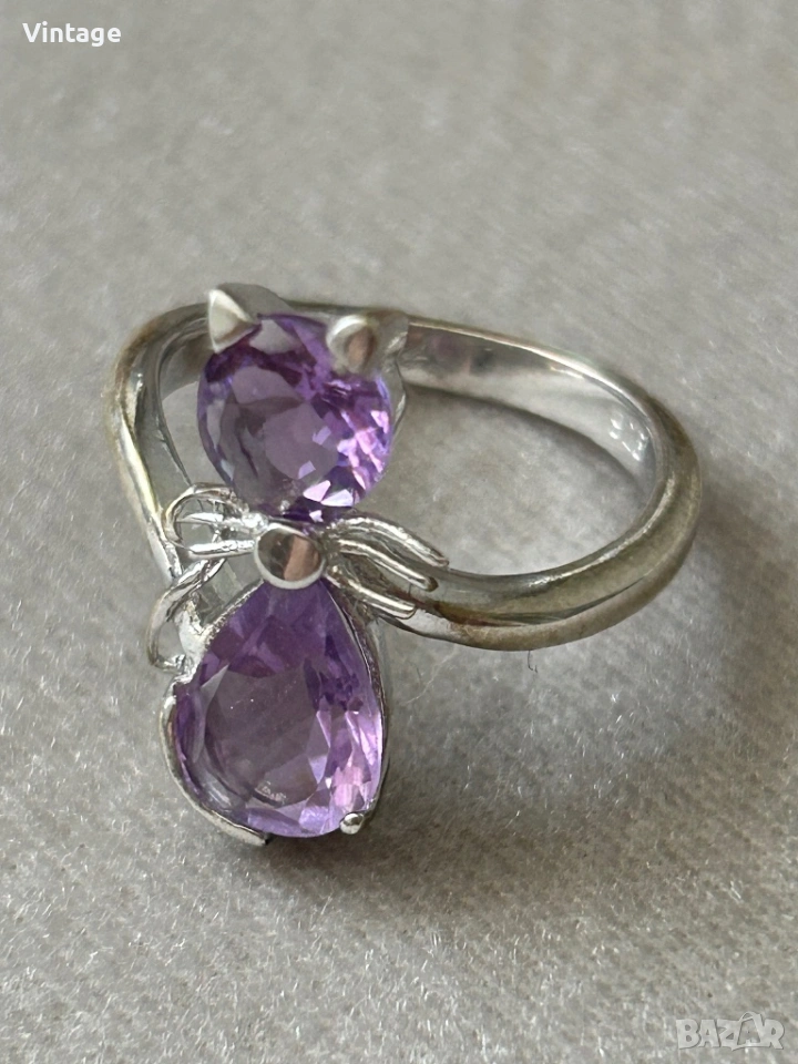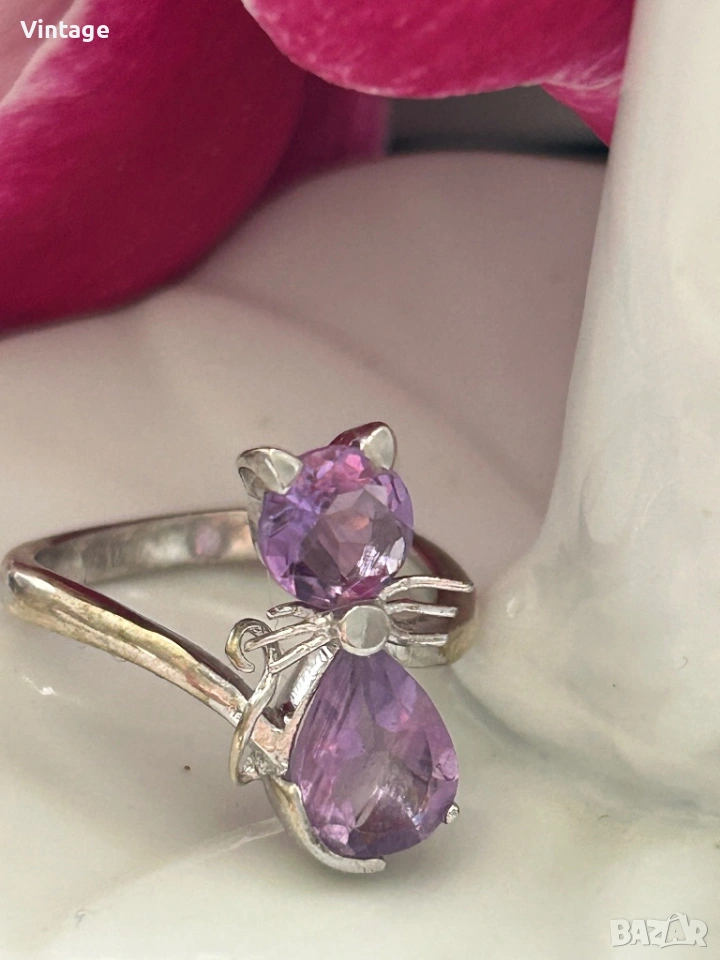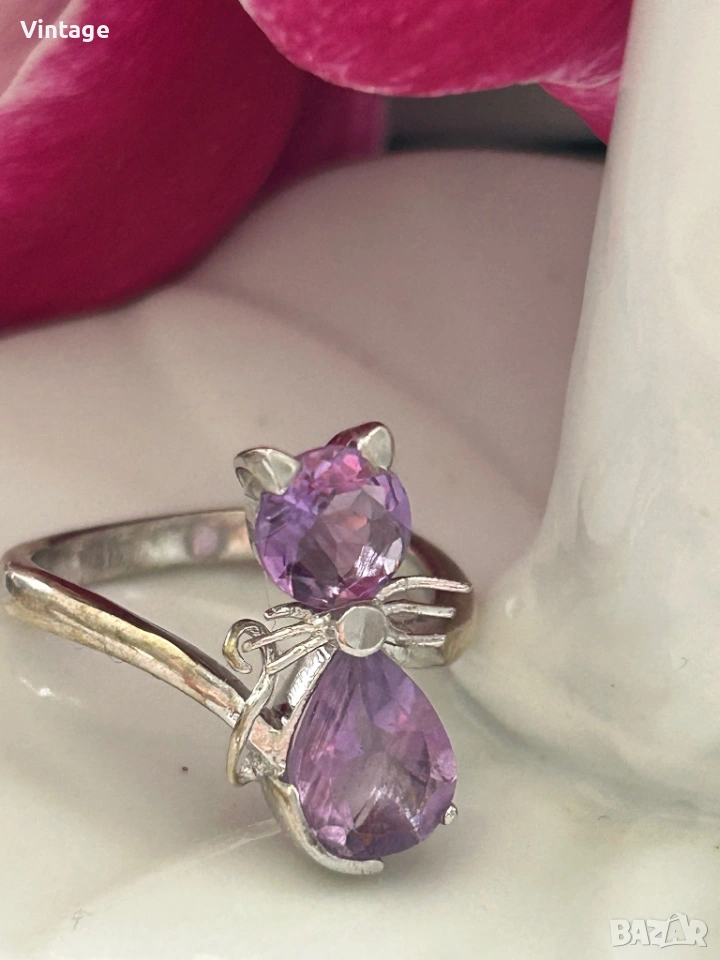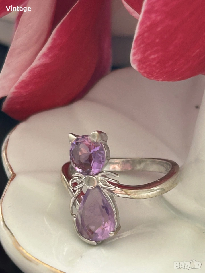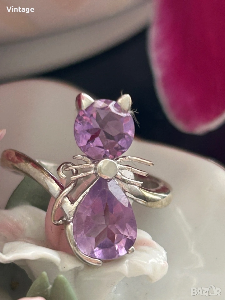 Много красив сребърен пръстен с естествен камък Аметист. Дизайнерска изработка Котенце . Размер 18мм. 4,20гр. Нов не е използван. Подходящ за изискан подарък.