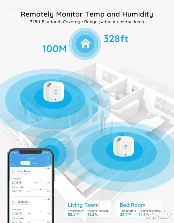 GoveeLife Bluetooth Thermometer Hygrometer е смарт устройство за точно измерване на температура и влажност в реално време. Подходящо за дом, спалня, оранжерия, винарна или склад, като осигурява лесен контрол чрез мобилно приложение.