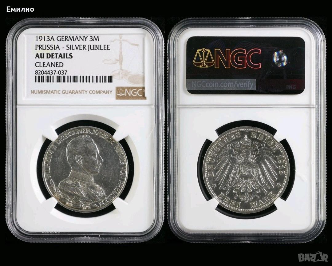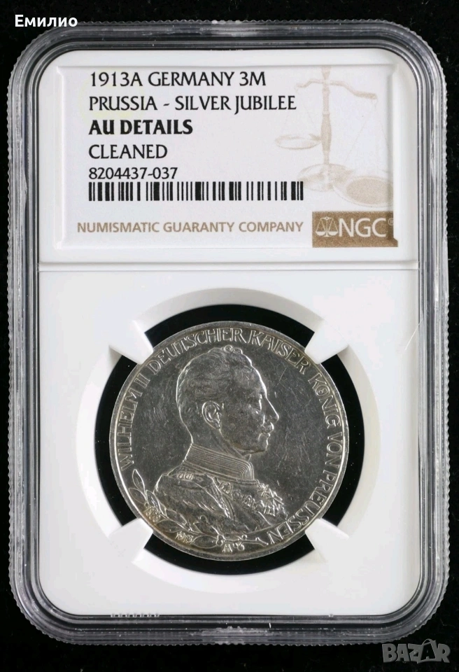 Продавам Сребърна Монета от Германия. 3 марки от 1913 А год. Сребърен Юбилей. Монетата е Сертифицирана от NGC AUNC
