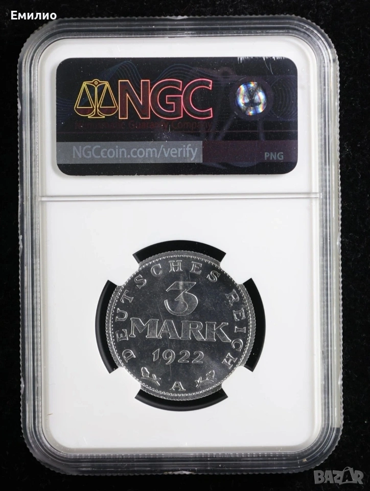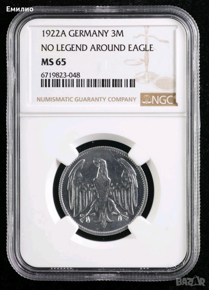 Продавам Рядка Монета от Германия. 3 марки от 1922 А год. Без надпис около орела!!! Сертифицирана от NGC MS 65