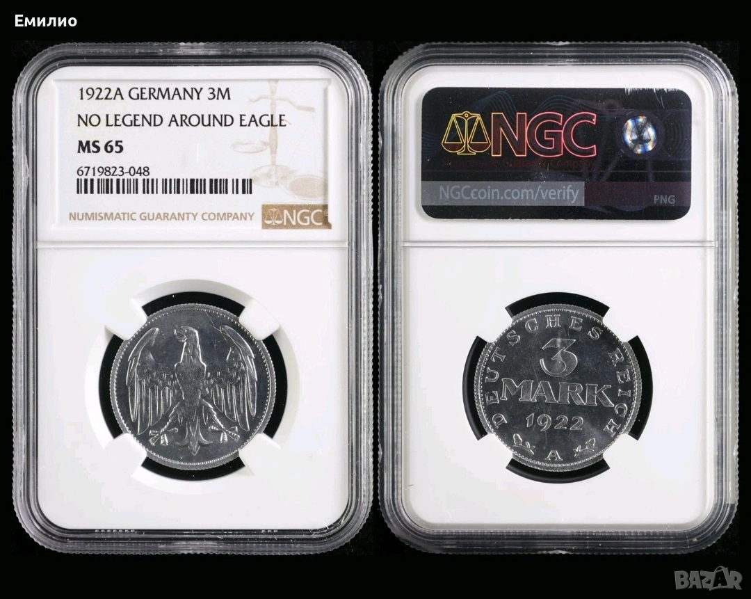 SCARCE. GERMANY 3 MARK 1922A NGC MS65, снимка 1 - Нумизматика и бонистика - 53982515 SCARCE. GERMANY 3 MARK 1922A NGC MS65, снимка 2 - Нумизматика и бонистика - 53982515 SCARCE. GERMANY 3 MARK 1922A NGC MS65, снимка 3 - Нумизматика и бонистика - 53982515 1/3
