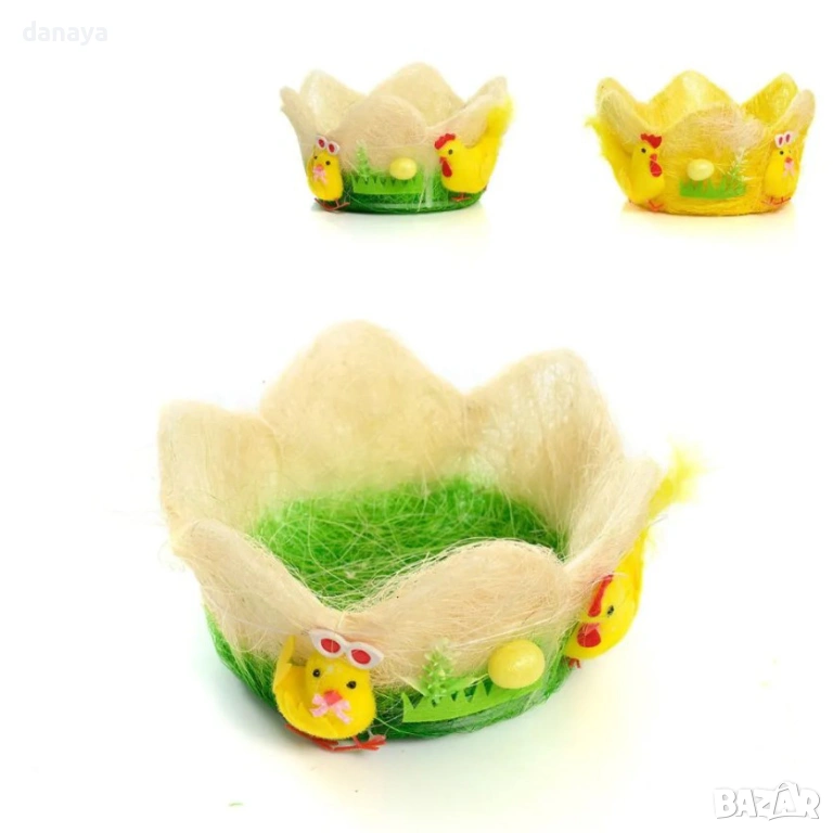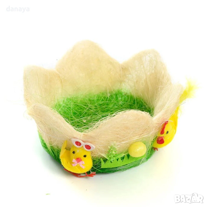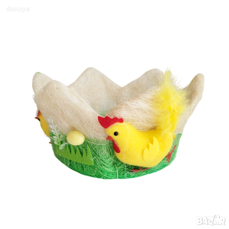 Изработката създава усещане за уют и домашна атмосфера, а детайлите с пиленца и тревни елементи придават завършен, тематичен вид, който веднага привлича вниманието. Подходящ както за семейна употреба, така и за украса в детски кът или подарък за близък човек.