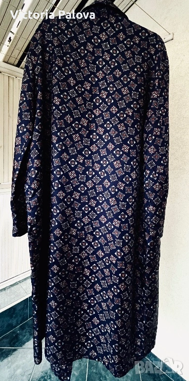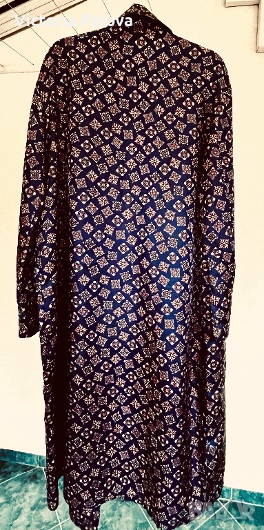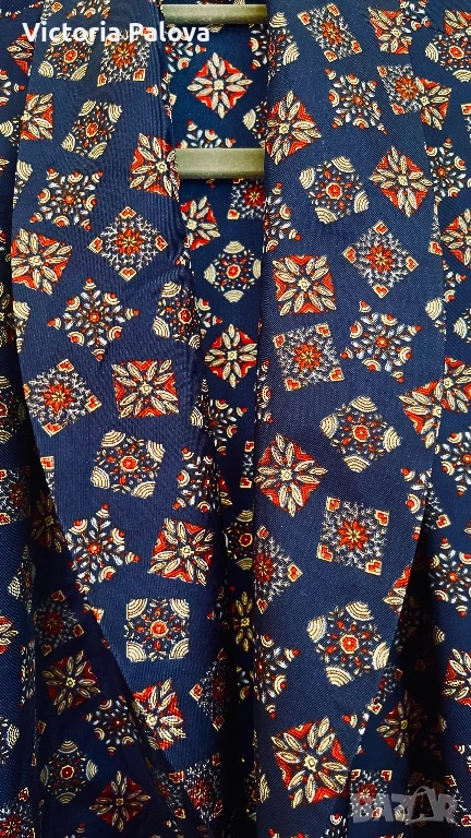 В наши дни подобни модели от чист триацетат са напълно изчезнали от масовото производство, което ги превръща в истинска колекционерска рядкост, търсена от ценителите на класическия мъжки стил по целия свят. Безупречната кройка с шал яка и изтънченият геометричен принт в наситени тъмносини тонове подчертават аристократизма и принадлежността към традициите на високия клас облекло. Притежанието на такъв екземпляр от Seidensticker не е просто избор на домашна дреха, а среща със „златната ера“ на модата, когато вещите са се създавали, за да служат вечно и да подчертават изискания вкус на своя собственик. Това е ценна инвестиция в стил, който е невъзможно да бъде възпроизведен от съвременните методи на производство.