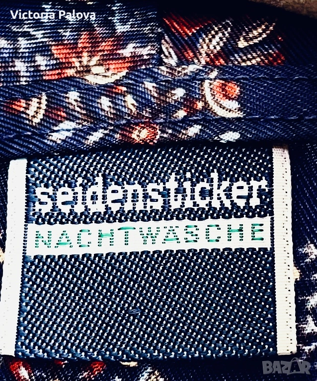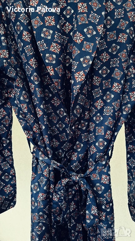 Този изключителен винтидж халат на легендарната немска марка Seidensticker е истински шедьовър на домашната елегантност, който обединява безупречната репутация на бранда с недостижимото качество на материалите от миналото. Изделието е изработено от благороден 100% триацетат – уникална материя, “течна коприна”, която се счита за върхово постижение в текстилното изкуство на своята епоха. Тази тъкан притежава хипнотизиращ копринен блясък и невероятно нежна, прохладна текстура, като същевременно е изключително устойчива на мачкане и запазва първоначалната си форма и наситеност на цветовете в продължение на десетилетия.