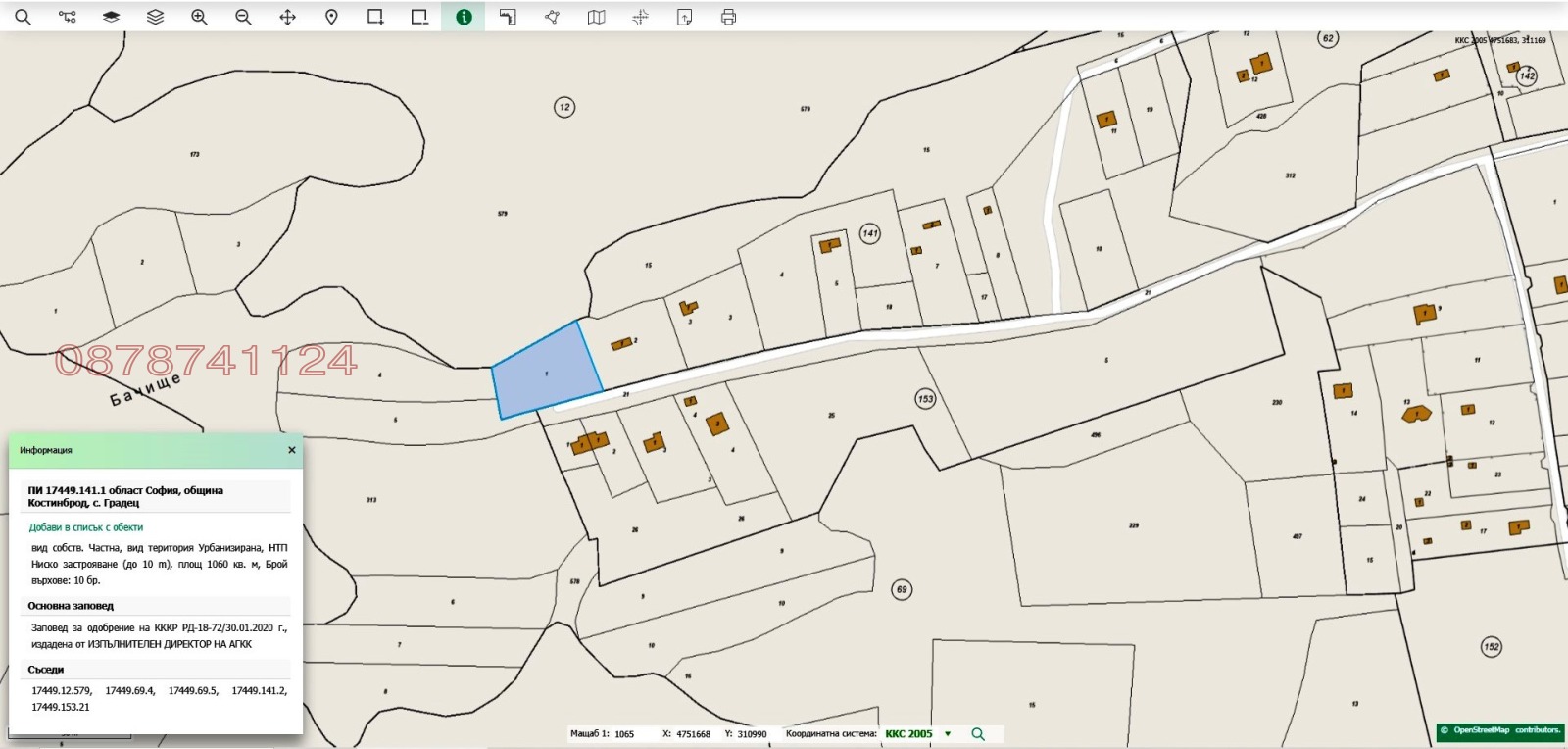 ПИ 17449.141.1 област София, община Костинброд, с. Градец, с площ от 1060 кв.м.