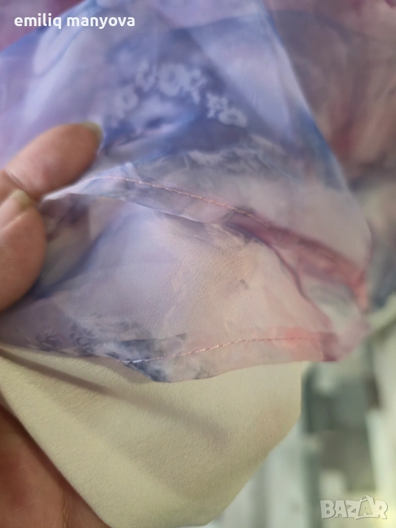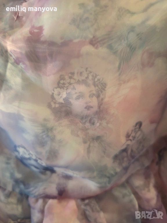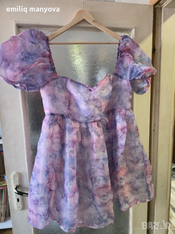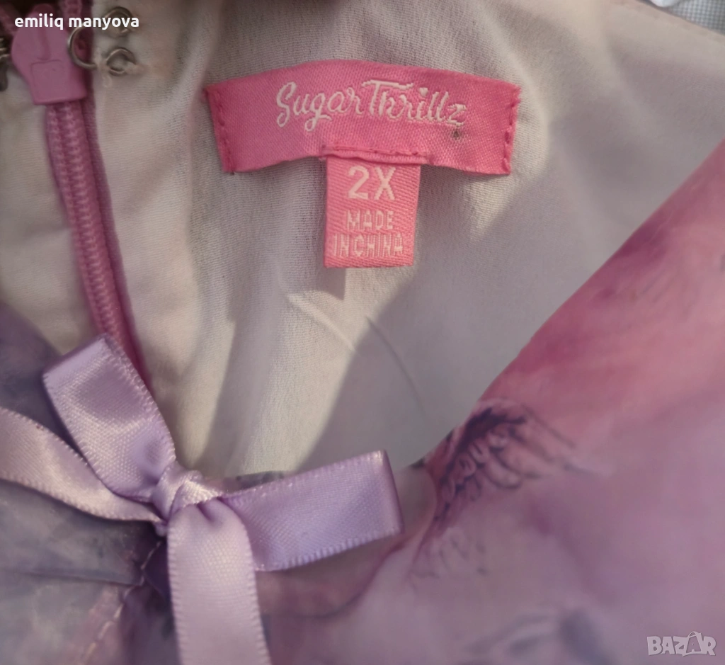 Много сладка нестандартна и ефирна рокля. Талията е висока, направена е от три пласта- първия е бяла подплата, а другите два са лилави с херовимчета. Полата и ръкавите когато е облечена стои бухнало. Марката е SUGAR THRILLZ .