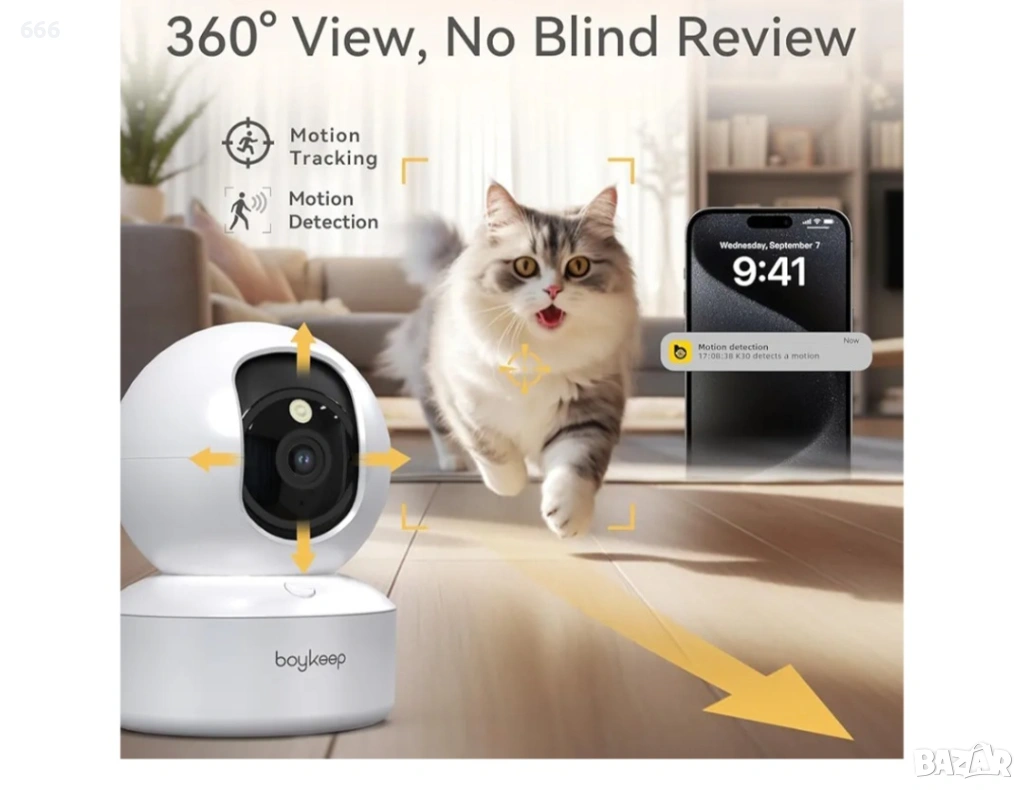 Камера за видеонаблюдение BoyKeep 2K вътрешна, Wi-Fi 360, нощно виждане, детектор на движение