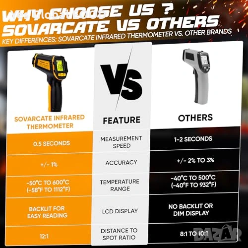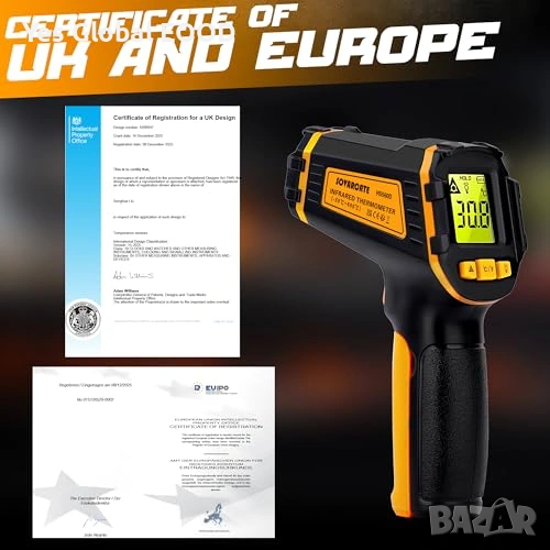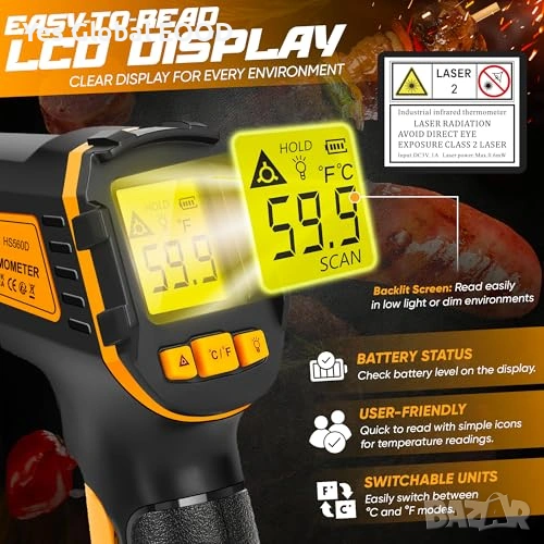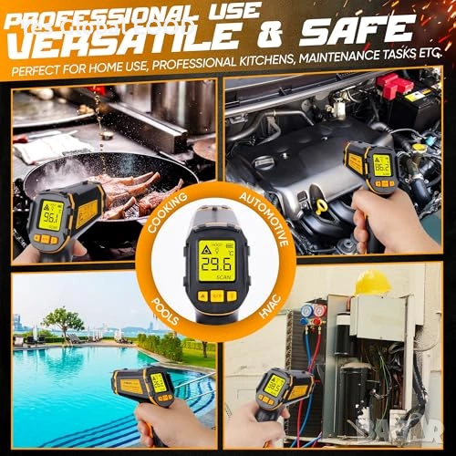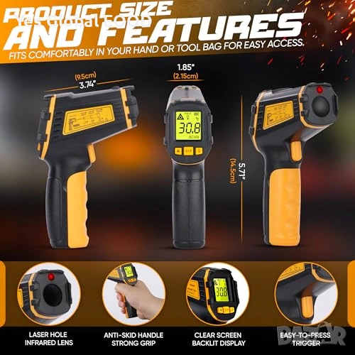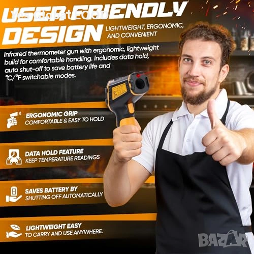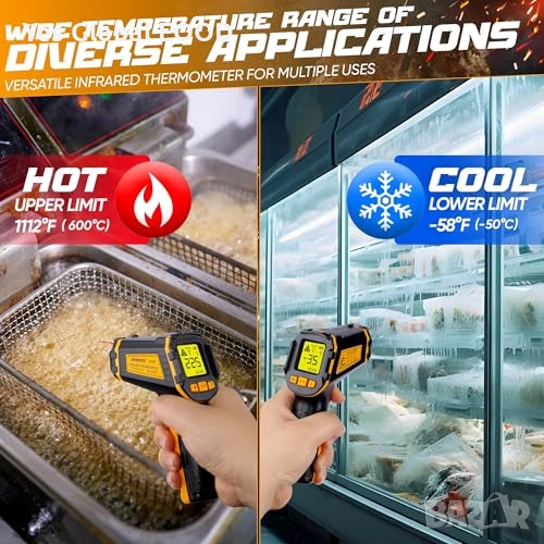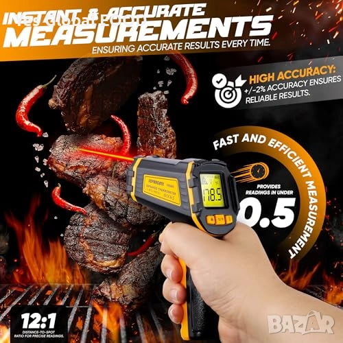 Безконтактен инфрачервен термометър (IR), предназначен за бързо и точно измерване на повърхностна температура в диапазон от -50°C до 600°C. Идеален за кухня, фурна, пица, хладилник, автомобилни части и индустриални приложения.