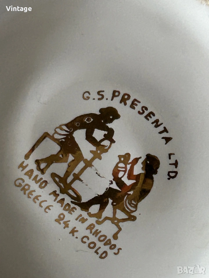 Рядък старинен гръцки порцеланов салфетник с ръчно рисувана позлата 24к. Много красив идеално състояние . Размер 12см/17см.