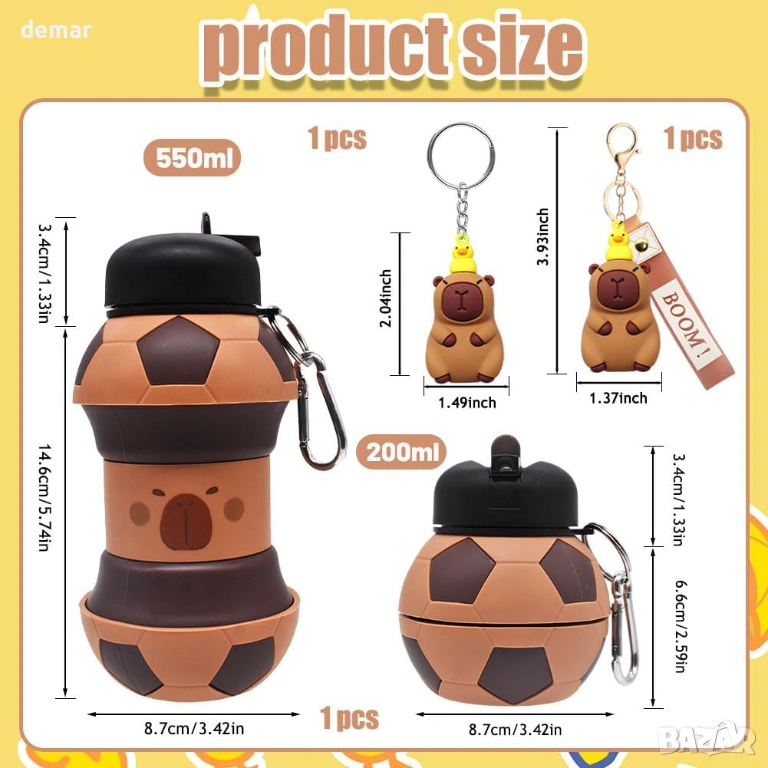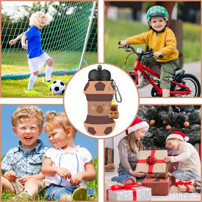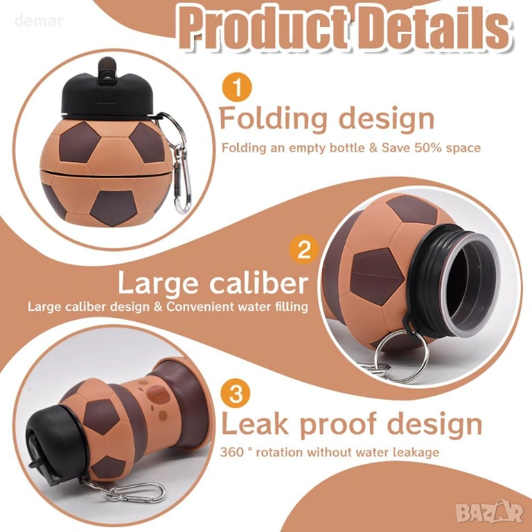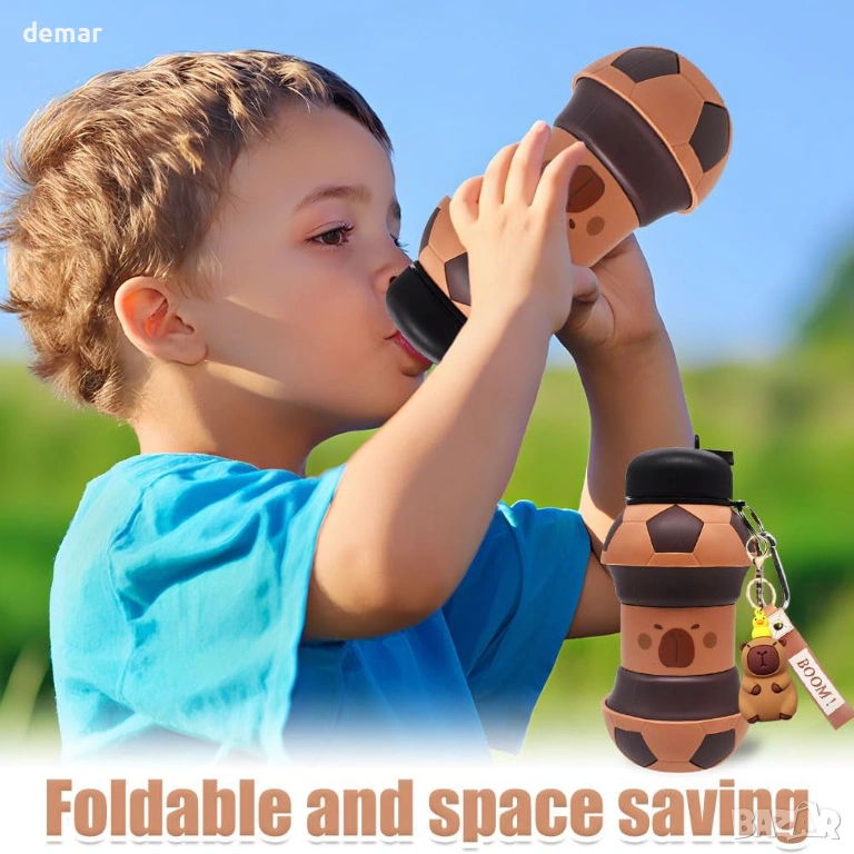 Бутилка за многократна употреба с футболна тема, предназначена да насърчава децата да останат хидратирани. Тя е изработена от безопасен силикон за хранителни цели без BPA/BPS, който е мек, нетоксичен и подходящ за ежедневна употреба. Предлага надеждна защита от протичане със сигурен заключващ се капак и издръжлива, удароустойчива конструкция, идеална за активен начин на живот. Лека и сгъваема, тя побира 550 мл, като същевременно спестява място, когато е празна, и включва карабинер за лесно носене в движение. Лесна за почистване с части, подходящи за съдомиялна машина, тя също така подкрепя екологичните навици чрез намаляване на пластмасовите отпадъци за еднократна употреба.