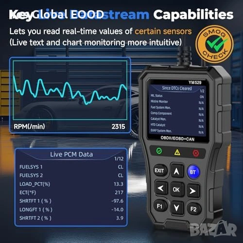Устройството е съвместимо с iPhone и Android и може да показва диагностична информация директно на екрана или чрез мобилно приложение. Осигурява също тест на батерията и анализ на състоянието ѝ.