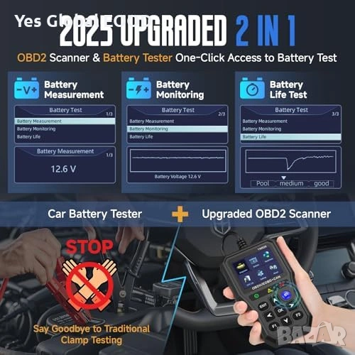 Мултифункционален Bluetooth OBD2 диагностичен скенер с вграден цветен дисплей 2.8" и функция за тест на акумулатор. Позволява бърза проверка на грешки в автомобила и мониторинг в реално време.