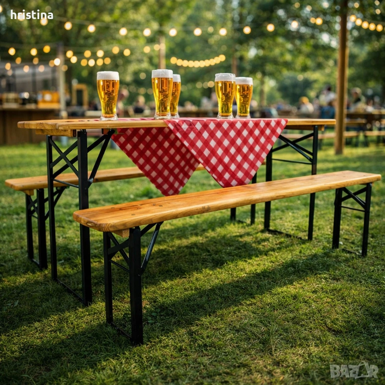 Материал: чамово дърво, устойчиво на атмосферни влияния и стоманени сгъваеми крака
