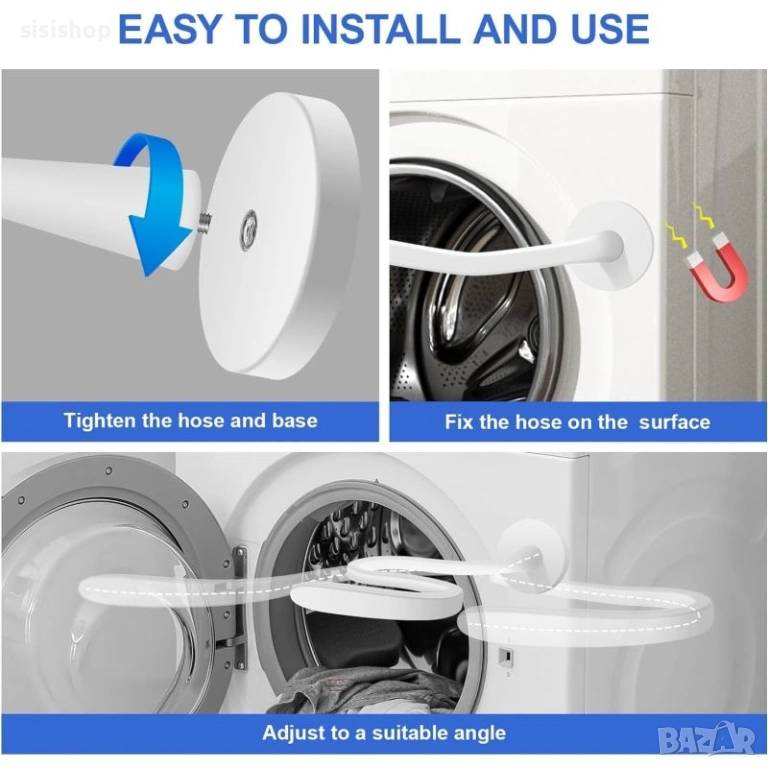 Лесен за ползване: Просто залепете магнита към пералнята и огънете рамото.