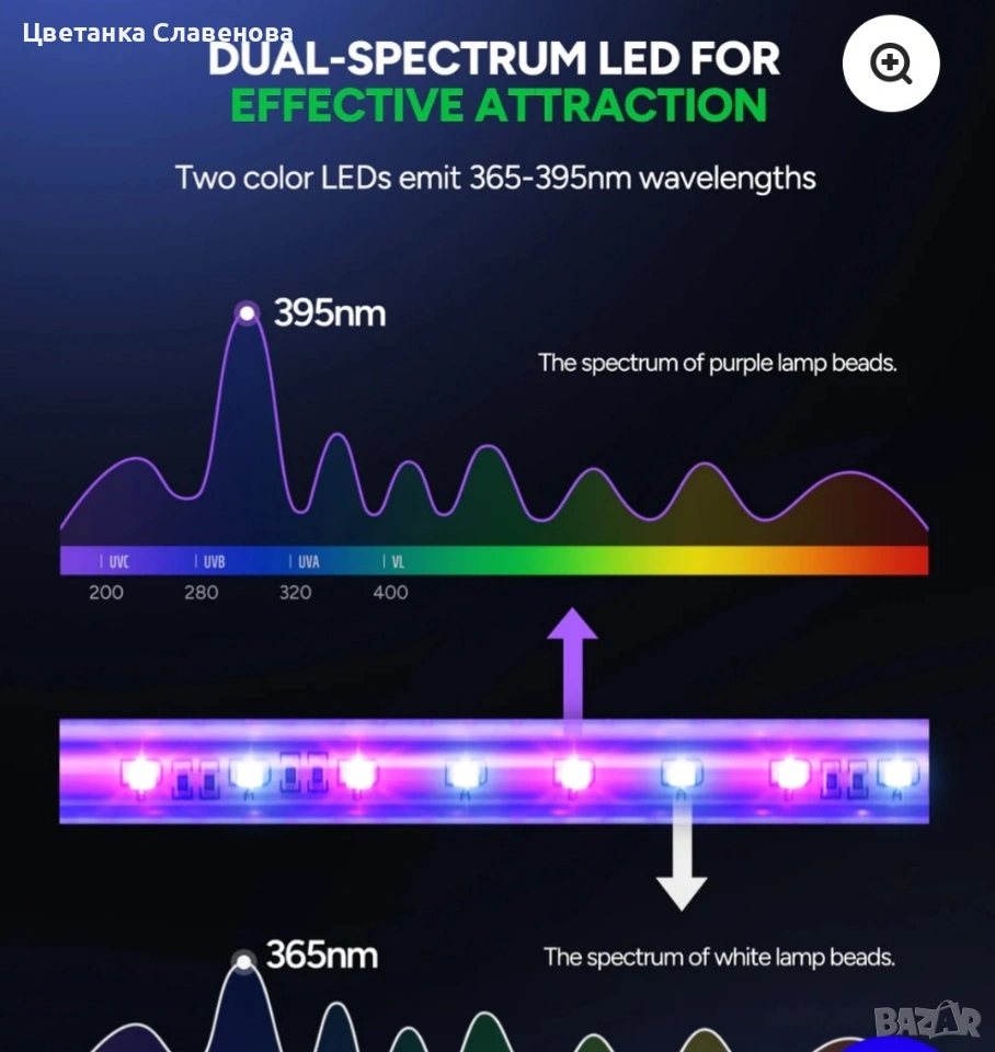 Високоефективни енергоспестяващи LED тръби: Нашите устройства за борба с насекоми използват 5W нискоенергийни LED тръби, които се отличават с дълъг живот до 30 000 часа. Използват комбинация от LED мъниста с дължина на вълната 365 nm и 395 nm, създавайки двутонов светлинен спектър. Тази комбинация е по-ефективна за привличане на голямо разнообразие от насекоми, включително комари, мухи, мухи и молци, като бързо ги удря с високоволтов ток.
