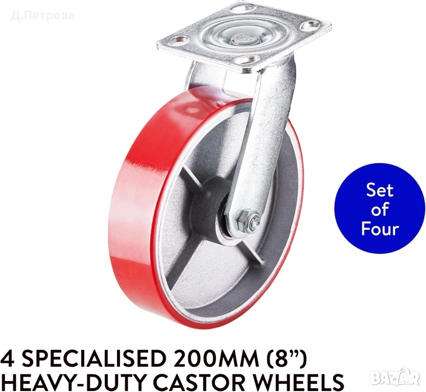 Всяко колело издържа до 380 кг, а комплект от 4 колела – до 1520 кг. Подходящи за лесно преместване на тежки мебели и оборудване.