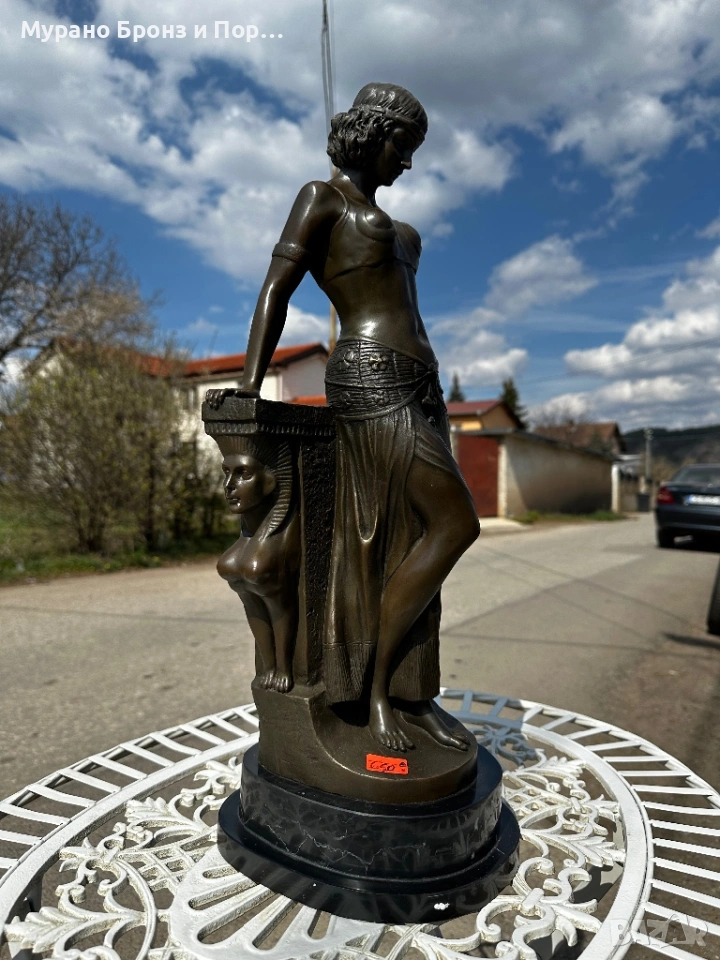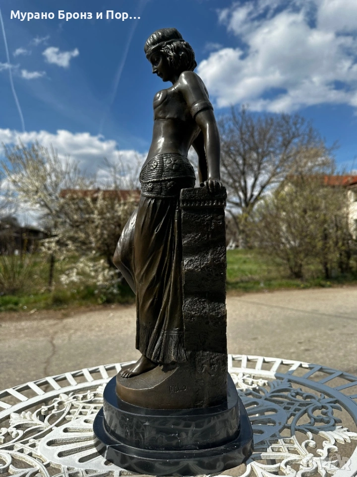 Продавам изключително детайлна и тежка бронзова статуетка в стил Арт Деко (Art Deco). Фигурата изобразява египетска девойка/танцьорка в изящна поза, подпряна на колона с характерни египетски релефи.