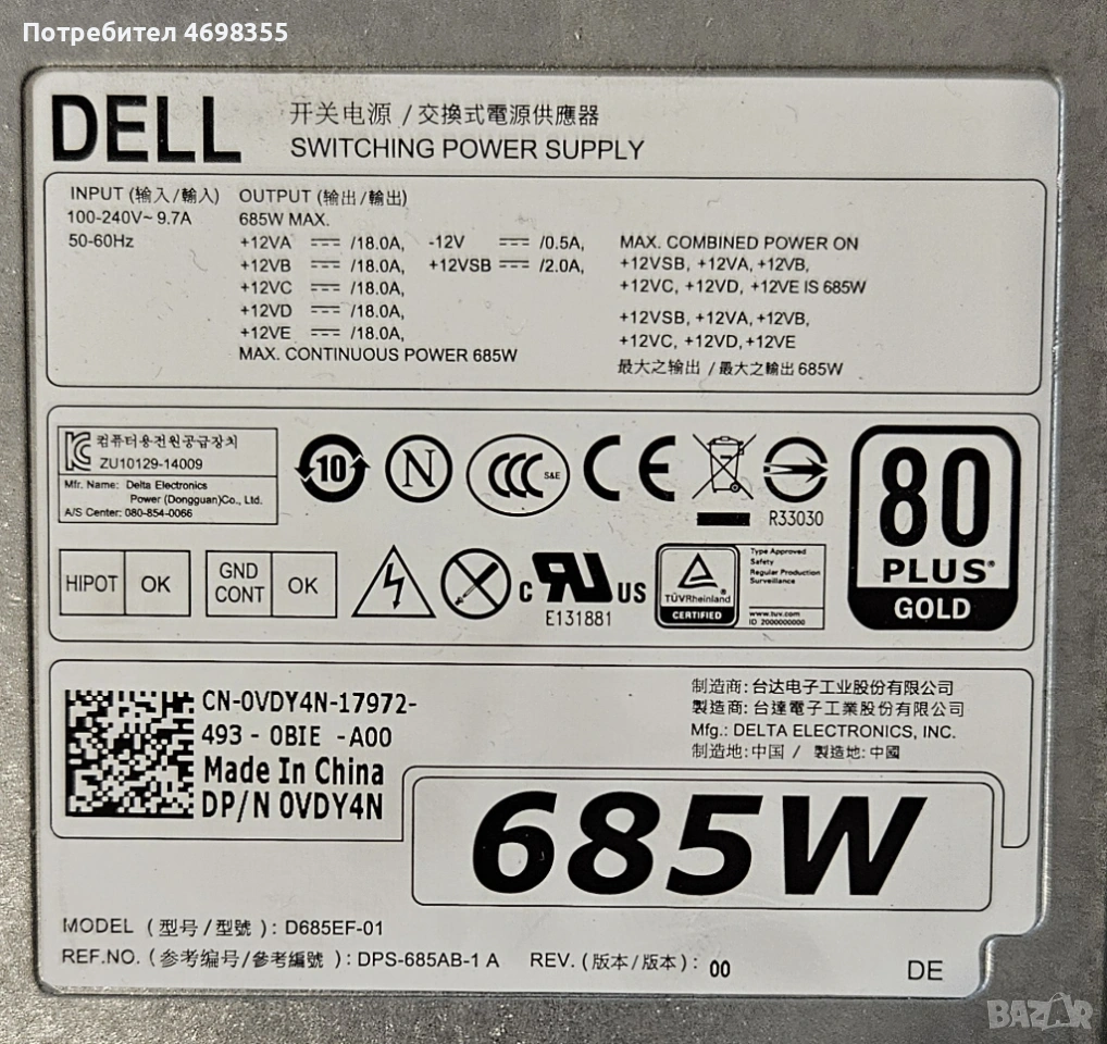 Dell 685W Power Supply D685EF-01 (Dell T5810, T7910) → Обява 53984317