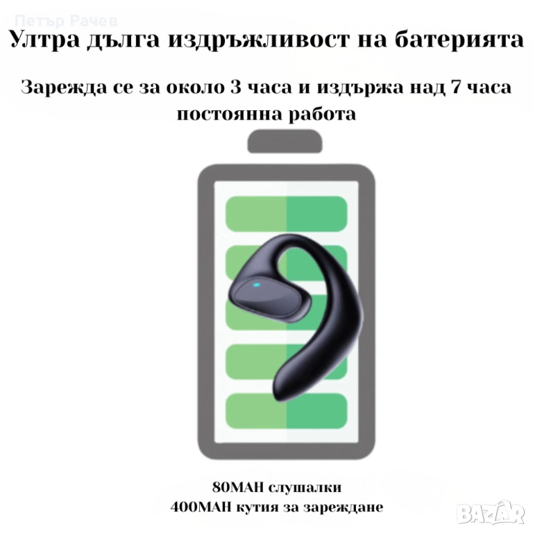 Капацитет на батерията: слушалки 80 mAh; зарядно калъфче 400 mAh.