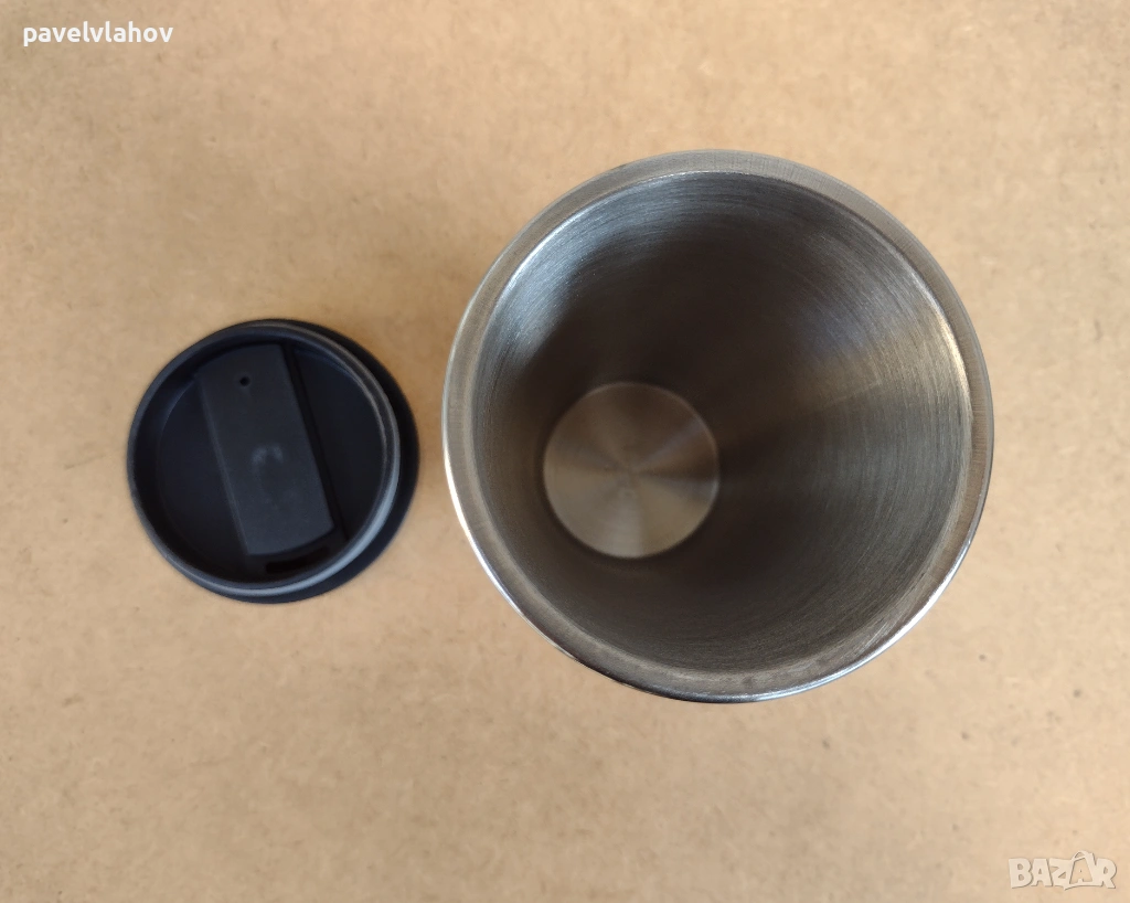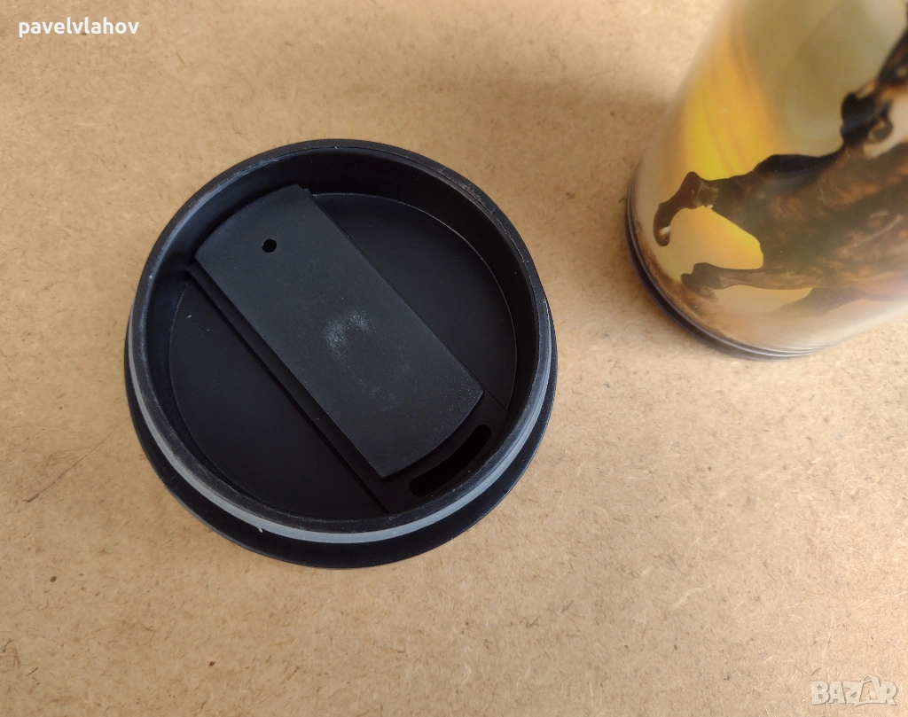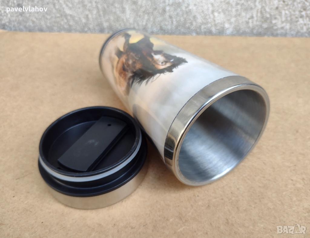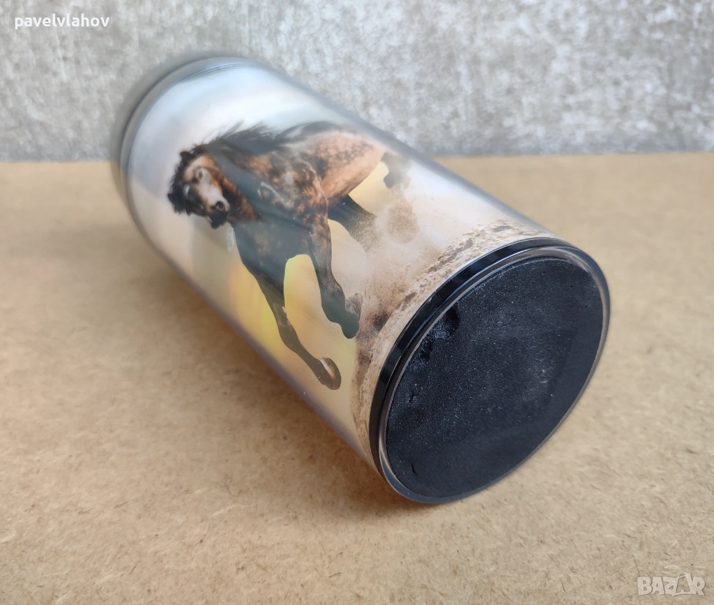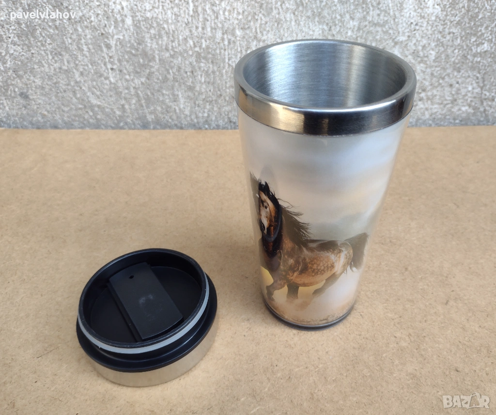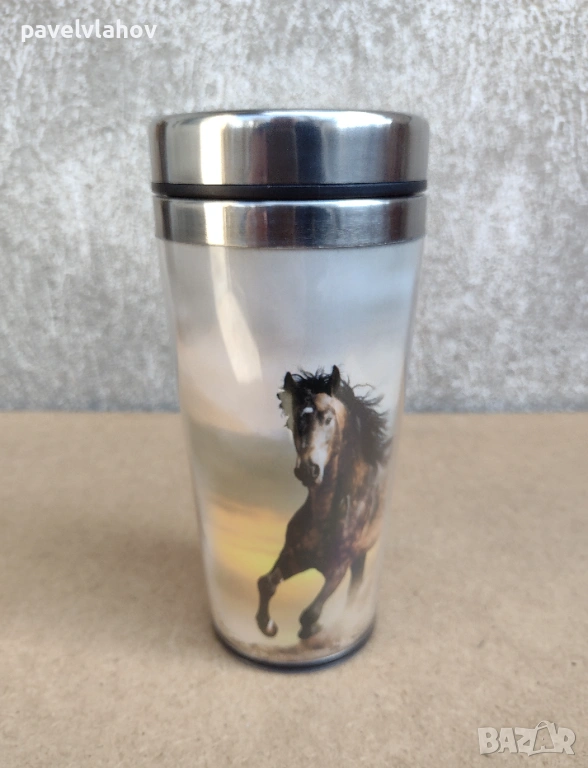 Термочашата е нова и неизползвана, в достатъчно добро състояние е. Производителят на чашата е LANCASTER. Вътрешността и е от неръждаема стомана, а външната и структура е от пластмаса, декорирана с два коня. Като количество течност събира до 470 мл. Габаритите и са - 18 см височина, а ширината и в горната зона е 8,1 см. Не ми е необходима, не съм я използвал, за тази цел е съхранявана добре - в шкаф.