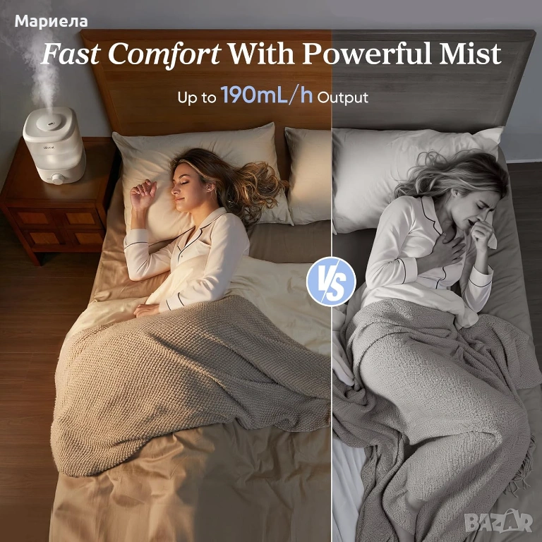 Работи до 25 часа на ниска мощност благодарение на СУПЕР ГОЛЕМИЯ си капацитет от 2,5 литра. Успокояващата влага помага за бързо облекчаване на запушването и сухотата в гърлото.