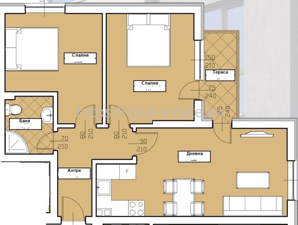 Разпределение: входно антре, дневна с кухненски бокс, две спални, санитарен възел и тераса.