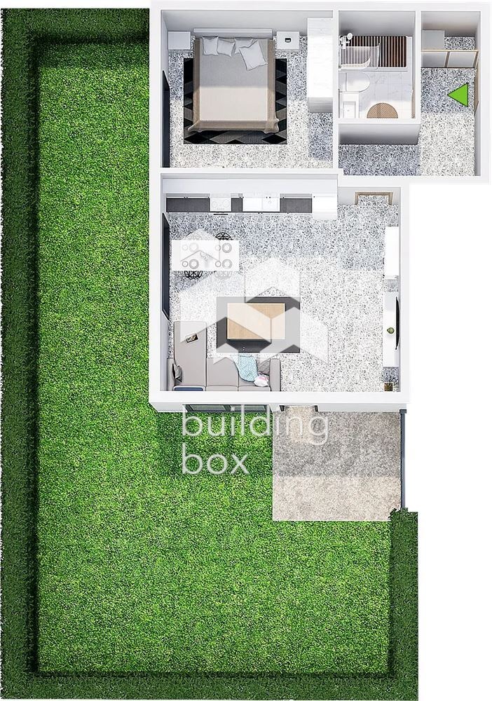 - РАЗПРЕДЕЛЕНИЕ: Просторна всекидневна с кухненски бокс с площ от 25,30 кв.м, спалня, баня с тоалетна и тераса.