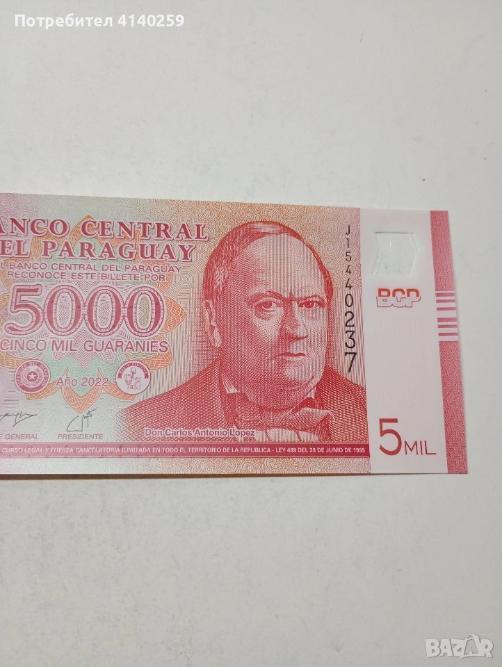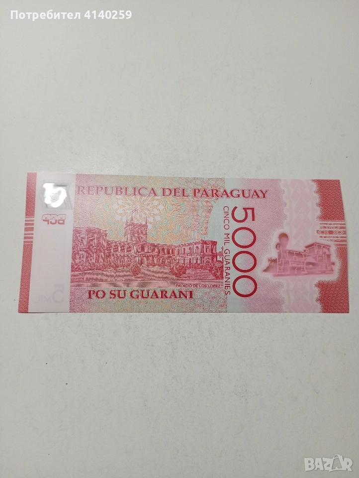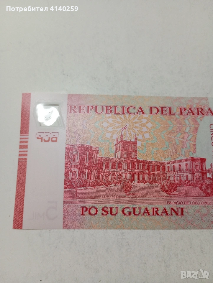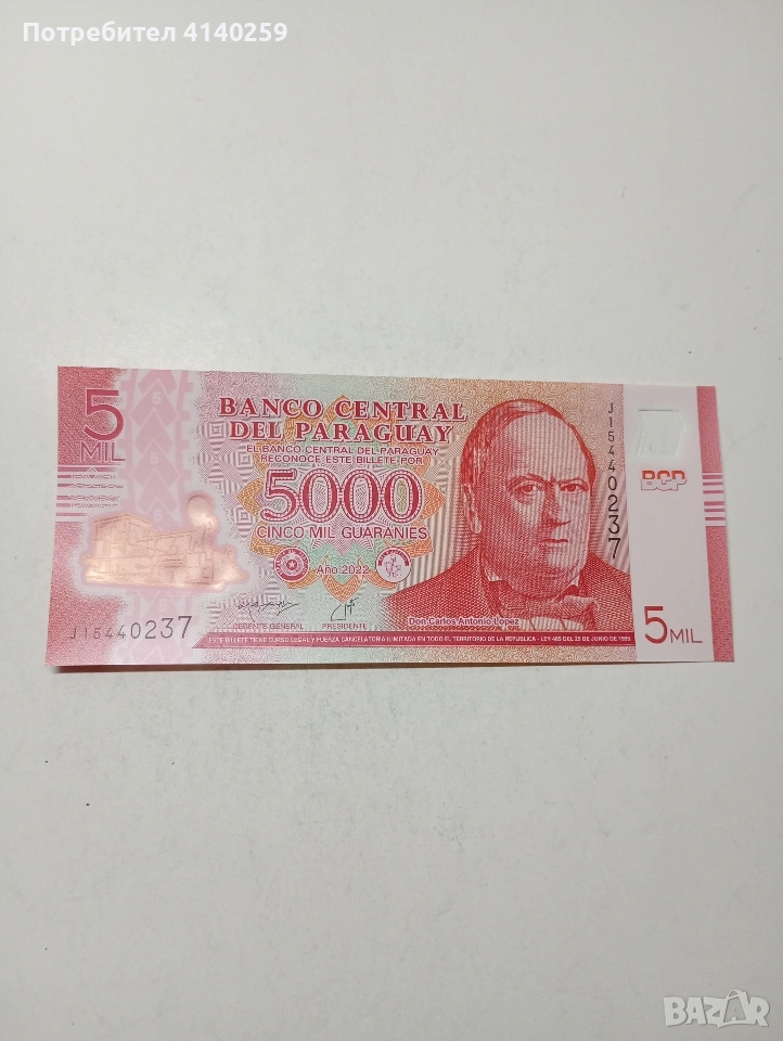 ПАРАГВАЙ БАНКНОТА 5,000 ГУАРАНИ 2022 Г ПОЛИМЕР СЪСТОЯНИЕ НОВО ПОЛУЧАВАТЕ СНИМАНАТА БАНКНОТА РАЗГЛЕДАЙТЕ ДРУГИТЕ МИ ОБЯВИ ДА КОМБИНИРАТЕ ДОСТАВКА ЕКОНТ ЗА ВАРНА ЛИЧНО