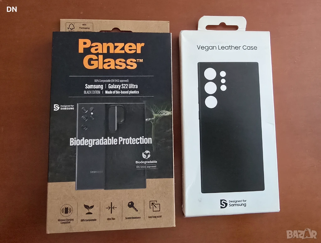 Два кейса за Samsung galaxy S22 Ultra. Единият е на Panzer glass, другият е Vegan Leather. Цената е за двата