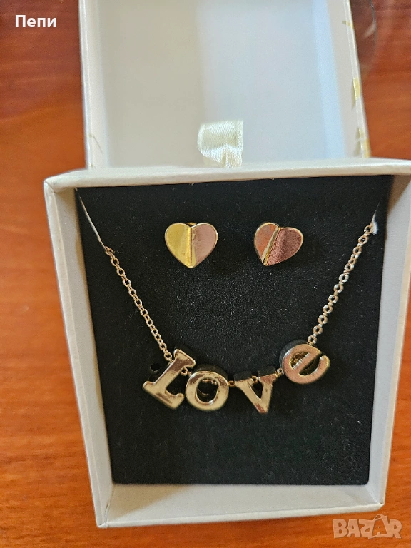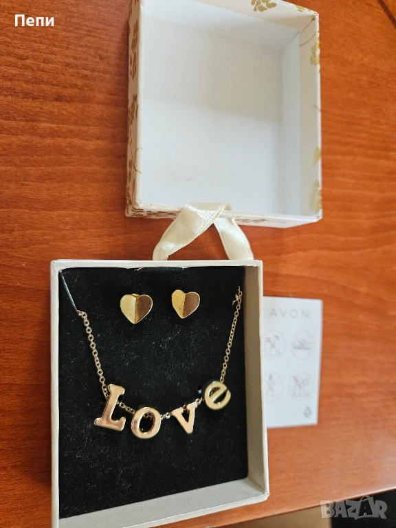 Нежен комплект марка AVON. Колието е с дължина 45 см. Има и удължител 7 см. Обиците са с винтче. Буквите на колието са подвижни. Големи са около 1 см. Подходящ и за подарък, тъй като си е в оригиналната кутийка.