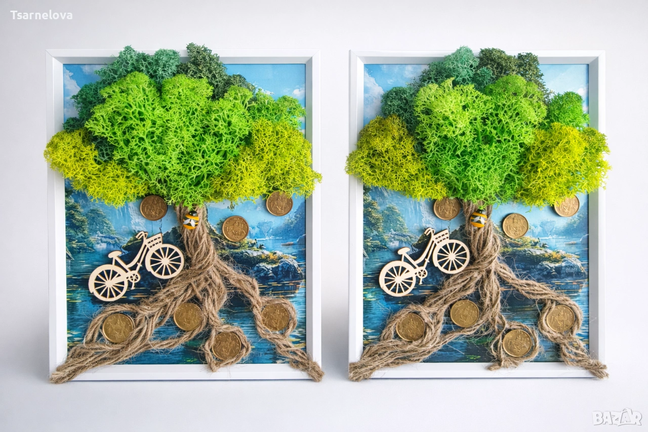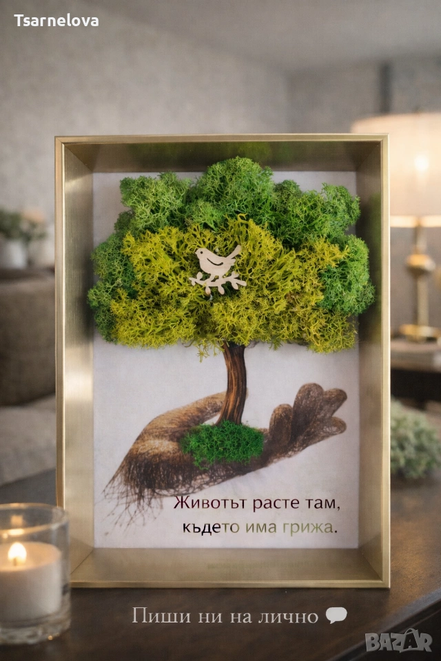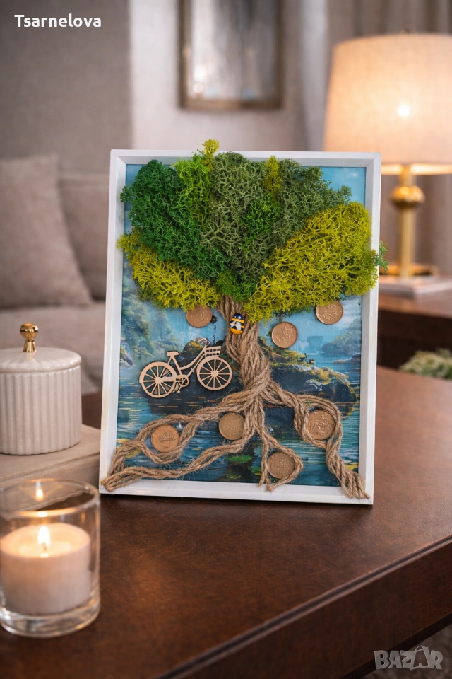 Уникална ръчно изработена картина, която ще внесе уют, стил и природна красота във всеки дом. Изработена с естествен стабилизиран мъх. Не изисква поддръжка – не се полива и не се пръска. Подходяща за подарък или декорация. Дизайнът съчетава дърво на живота със символика за растеж, стабилност и благополучие, допълнен с интересни детайли и естествени материали. Размер: (15/20 см) Подходяща за хол, спалня, офис или детска стая Перфектен избор за подарък за рожден ден, нов дом или специален повод! Пиши ми за въпроси или поръчка