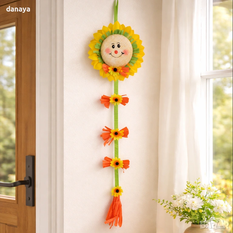 Изработена с внимание към детайла, декорацията комбинира текстилни елементи и весели флорални акценти, които създават жив и приветлив вид. Дългият висящ дизайн я прави изключително ефектна и видима, без да заема място – перфектно решение за бърза и красива великденска декорация у дома.