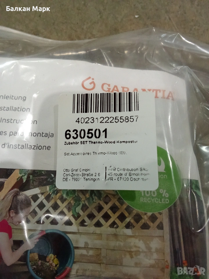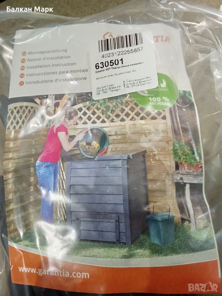 Продавам висок клас градински компостер Garantia Thermo-Wood 400L. Продуктът е част от разнообразна палетирана стока, директен внос от Германия. Изключително качество на изработка от немския лидер Otto Graf GmbH.